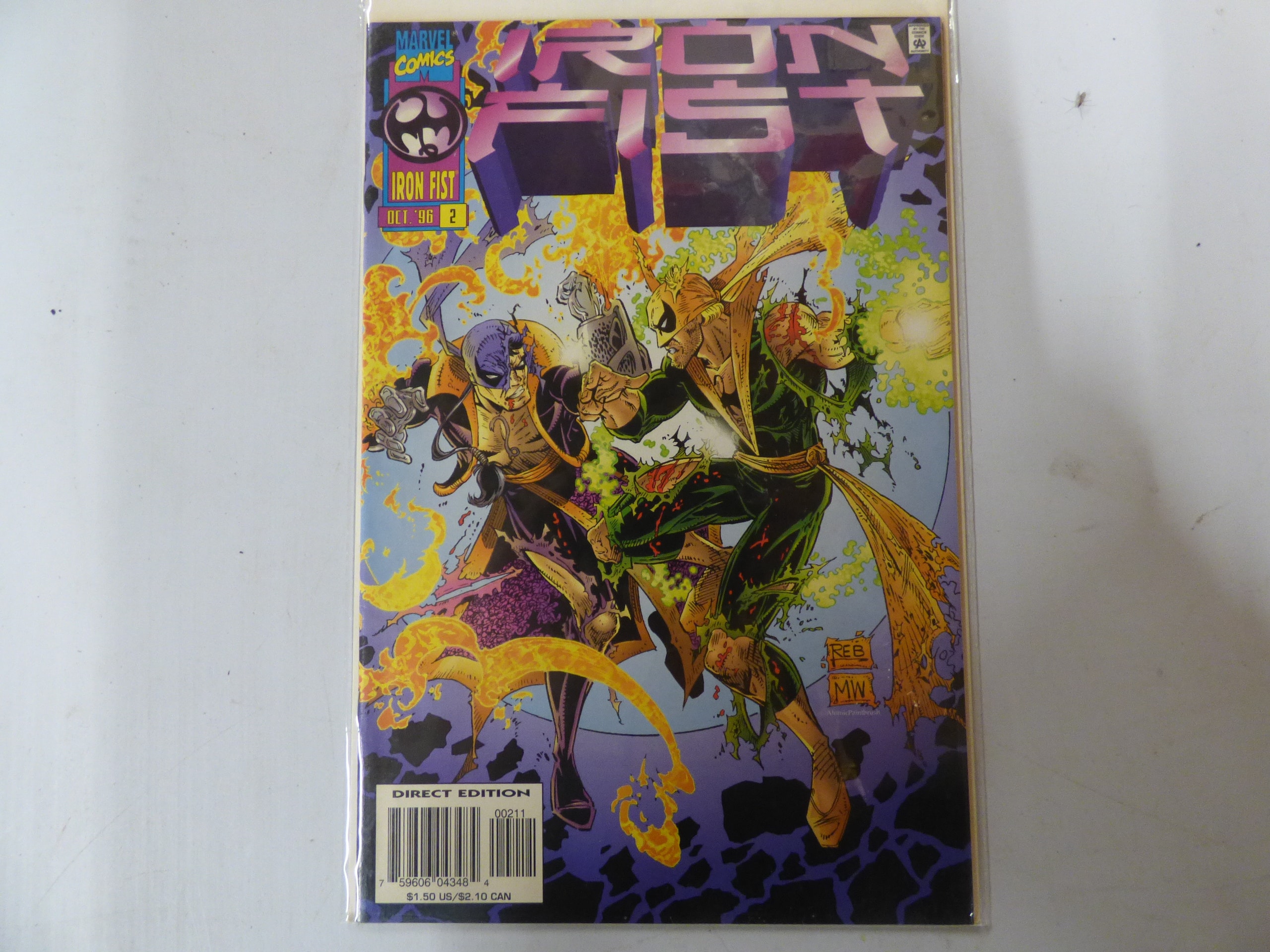 A single Marvel Comics Iron Fist comic book, issue #2, October ’96, with a purple, yellow, green, and blue “DIRECT EDITION” cover, priced $1.50 US/$2.10 CAN, signed “REB MW”.