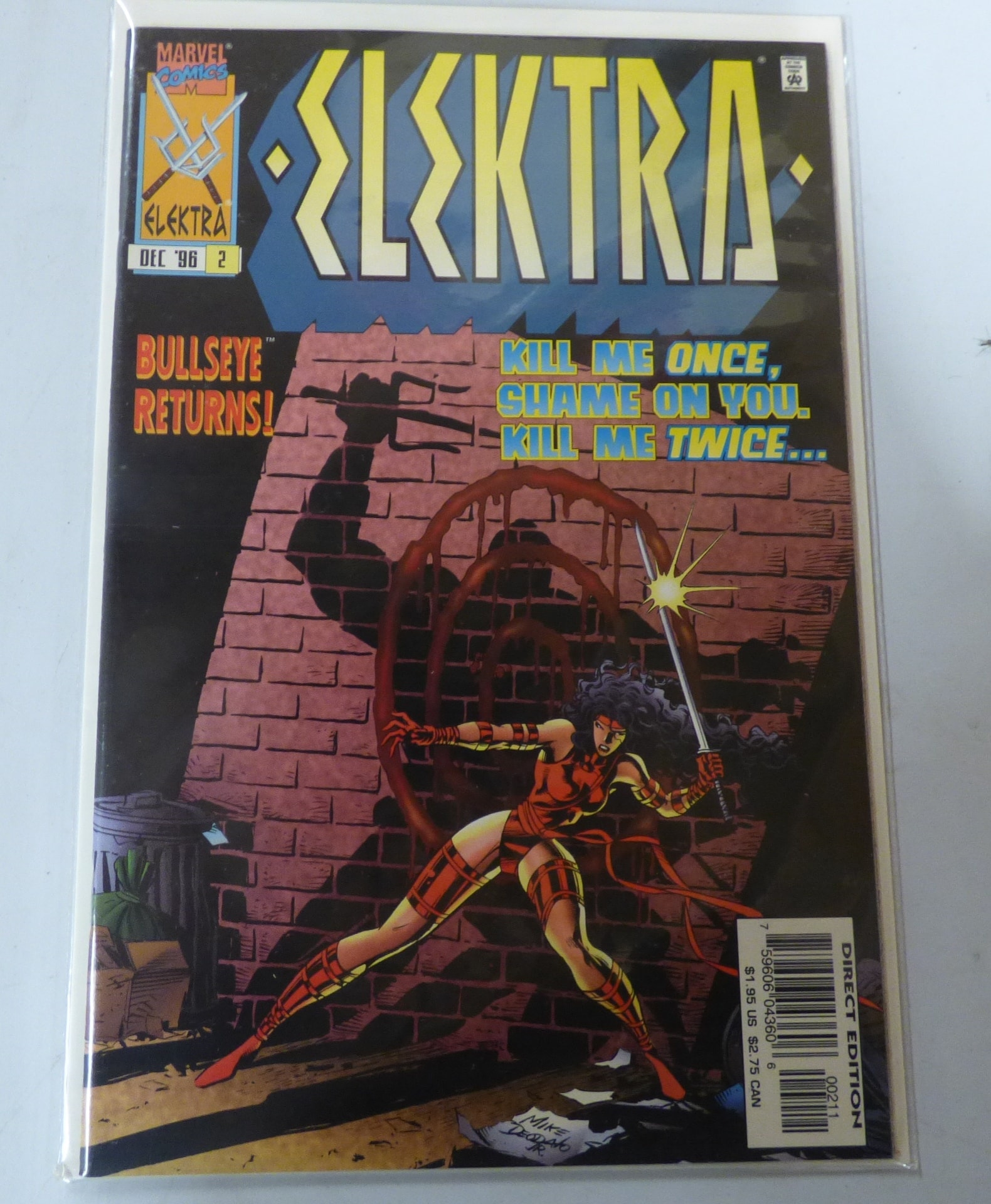 A Marvel Comics ‘Elektra’ issue #2 comic book from December 1996, featuring a red, black, and yellow cover with Elektra, visible text ‘BULLSEYE RETURNS!’, ‘KILL ME ONCE, SHAME ON YOU. KILL ME TWICE…’, ‘DIRECT EDITION’, and a cover price of $1.95 US / $2.75 CAN.