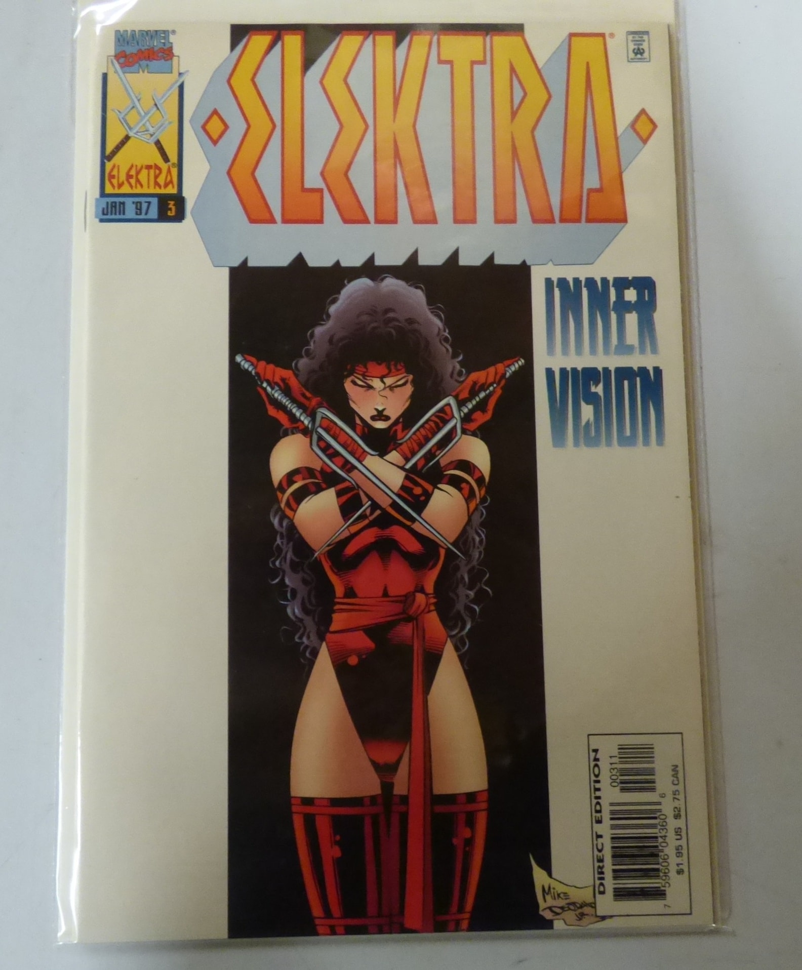 A Marvel Comics “ELEKTRA: INNER VISION” comic book, issue 3 from January 1997, is a Direct Edition featuring Elektra in a red costume with black hair, with visible text “Mike Deodato Jr.” and an original price of $1.95 US.