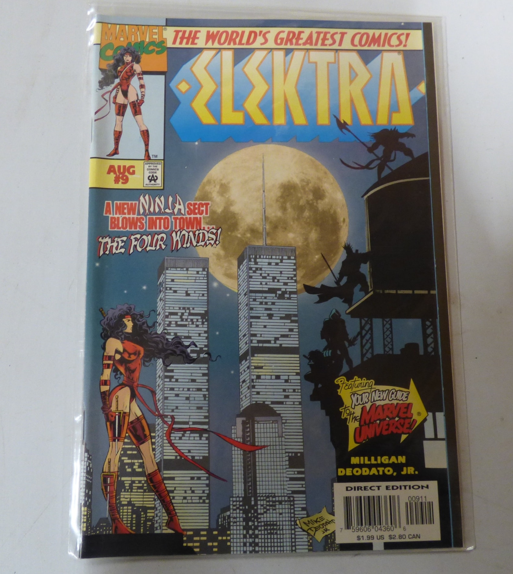 A single comic book titled ‘ELEKTRA’ issue #9 (August) by Marvel Comics, featuring Elektra in a red costume against a cityscape with a full moon, a ‘DIRECT EDITION’ by Milligan Deodato, Jr., originally priced at $1.99 US.