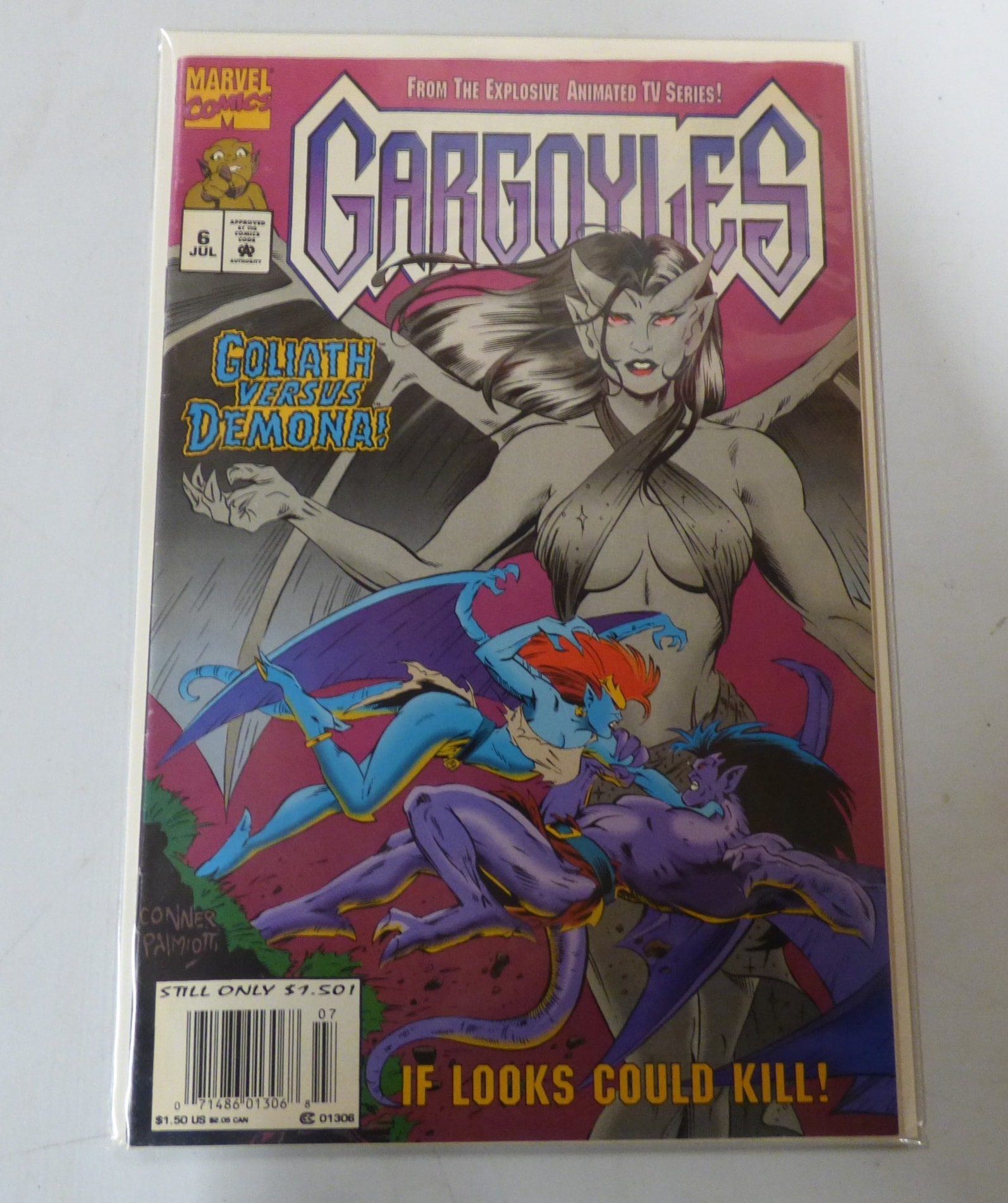 A Marvel Comics “Gargoyles” comic book, issue #6 from July, featuring a predominantly purple, blue, grey, and red cover with a magenta background, and visible text including “GOLIATH VERSUS DEMONA!”, “CONNER PALMIOTTI, ” and “IF LOOKS COULD KILL!”.