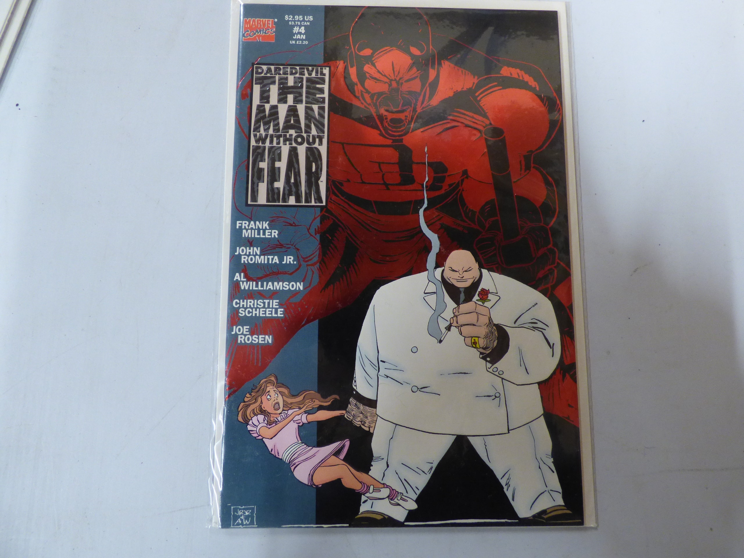 A single Marvel Comics comic book, ‘Daredevil The Man Without Fear #4,’ featuring Kingpin on a red and black cover, credited to Frank Miller and others, originally priced at $2.95 US.