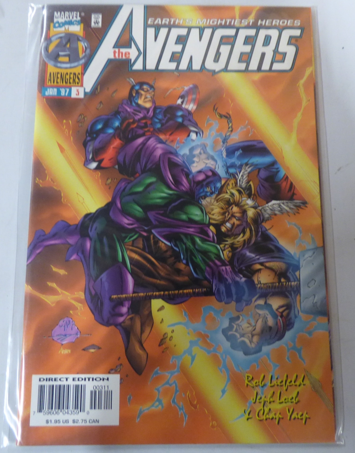 A Marvel Comics ‘The Avengers’ comic book, issue #3 from January ’97, featuring an orange and yellow cover with characters in purple, green, and blue, marked as a ‘DIRECT EDITION’ with a visible price of $1.95 US.