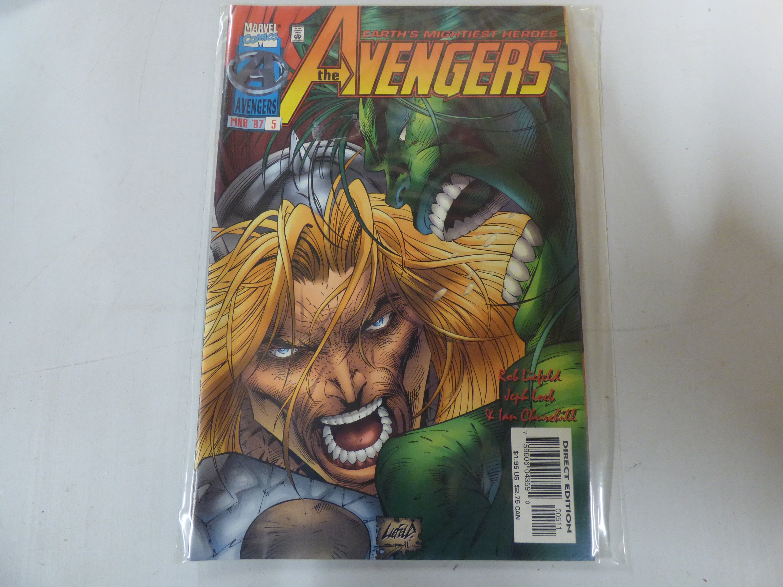 A Marvel Comics The Avengers issue #5 comic book from March ’97, featuring Hulk and a blonde character on the cover, credited to Rob Liefeld, Jeph Loeb, and Ian Churchill, with a Direct Edition price of $1.95 US.