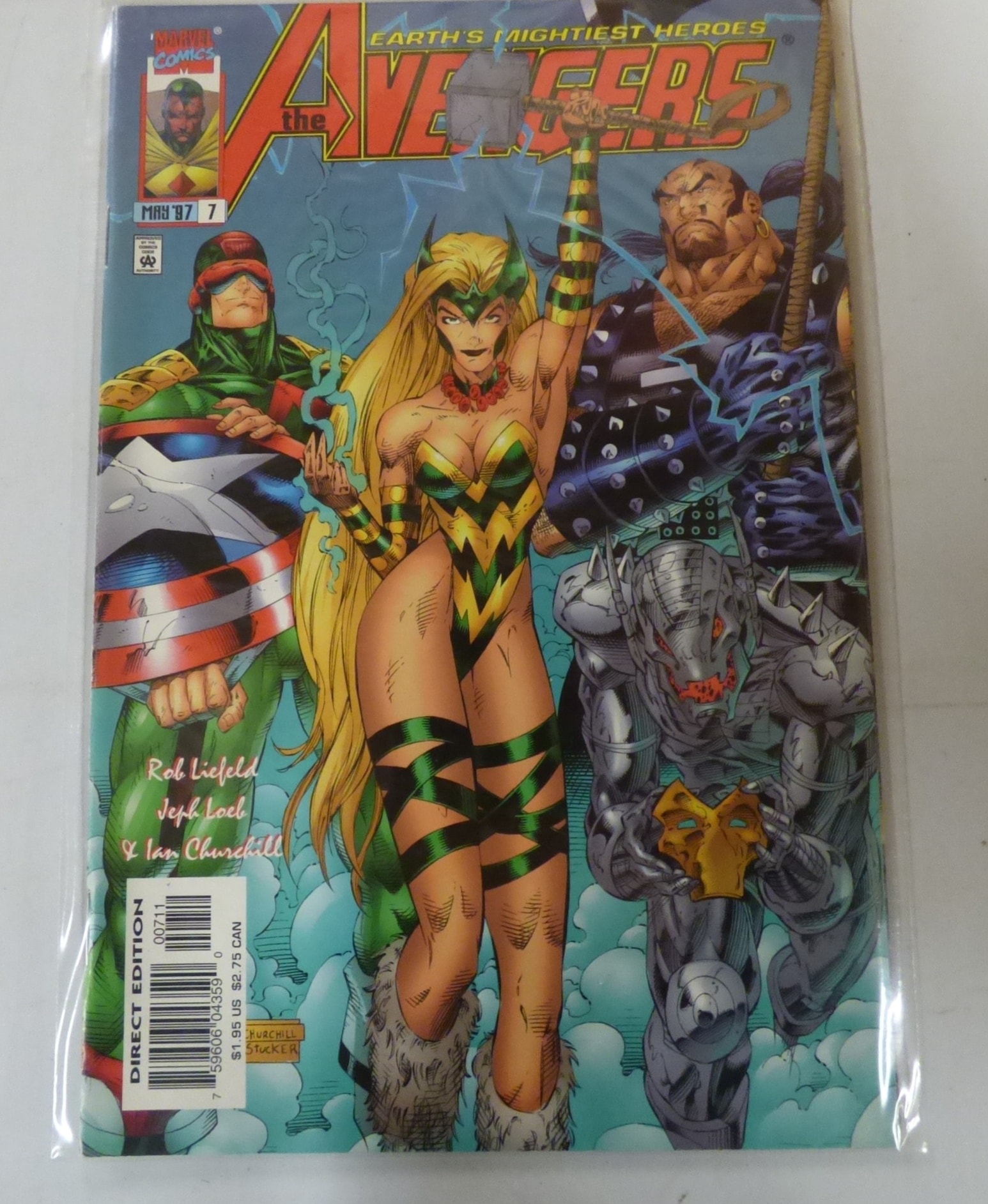 A Marvel Comics ‘the AVENGERS’ issue #7 comic book from May ’97, featuring colorful characters and ‘EARTH’S MIGHTIEST HEROES’ branding, with creators Rob Liefeld, Jeph Loeb, & Ian Churchill.