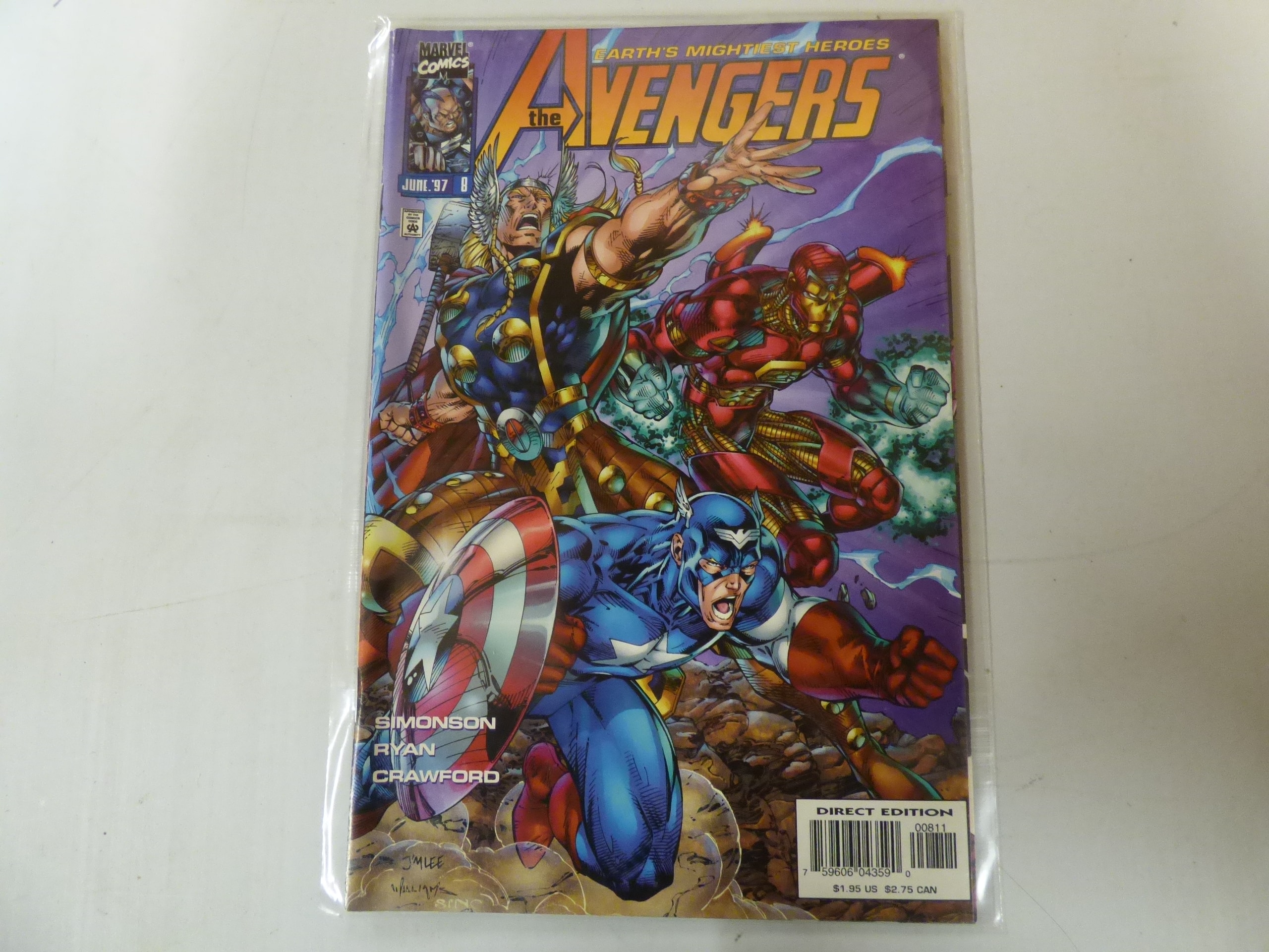 A Marvel Comics ‘The Avengers’ comic book, issue #8 from June ’97, featuring blue, red, and gold characters on a purple background, with ‘EARTH’S MIGHTIEST HEROES’ and ‘SIMONSON RYAN CRAWFORD’ visible, marked ‘DIRECT EDITION’ with a ‘J’mLee’ signature, originally priced at $1.95 US.