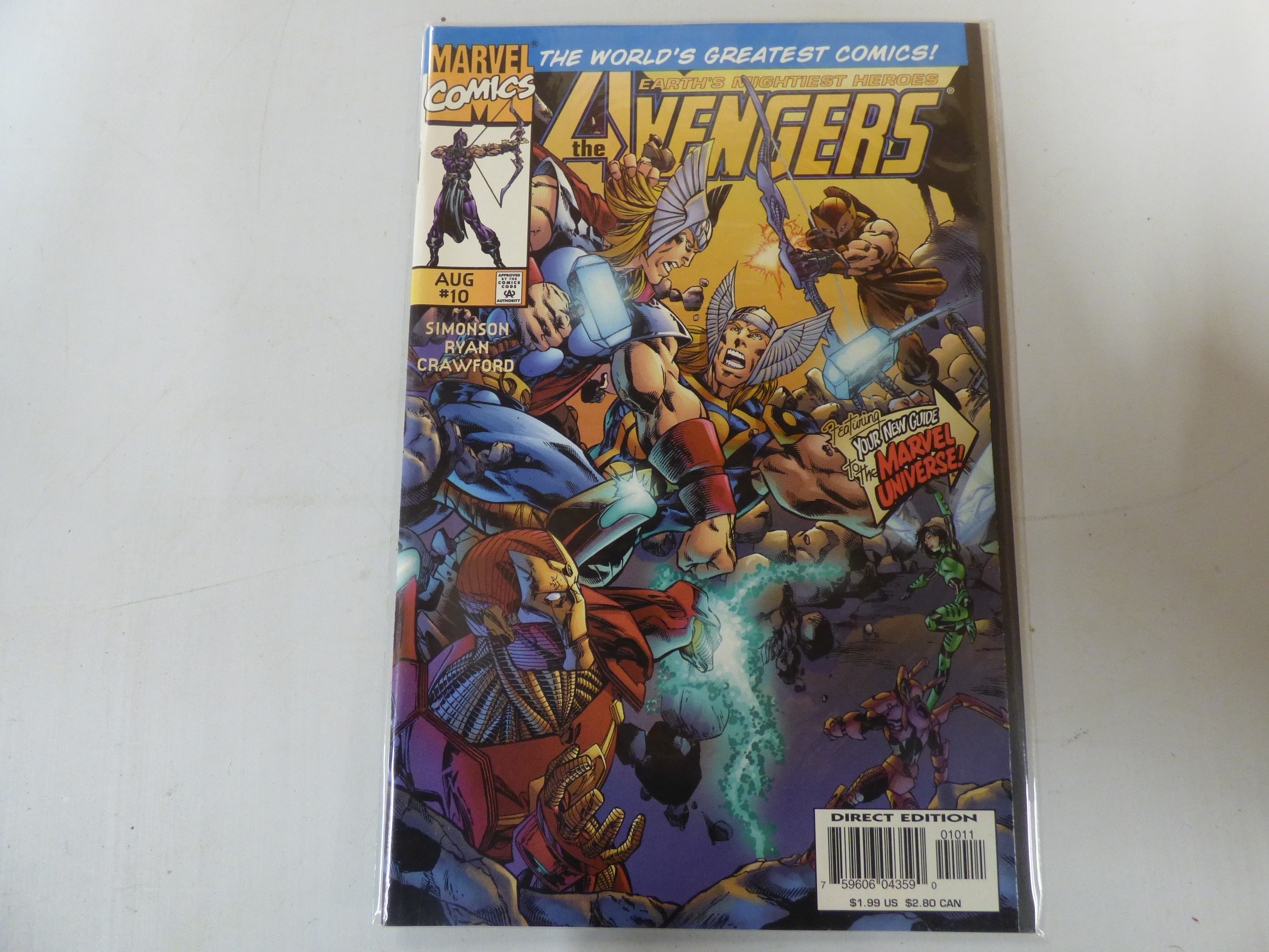 A Marvel Comics “The Avengers” issue #10 comic book from August, a Direct Edition, featuring colourful illustrations of superheroes including Thor and Iron Man, with a visible price of $1.99 US.