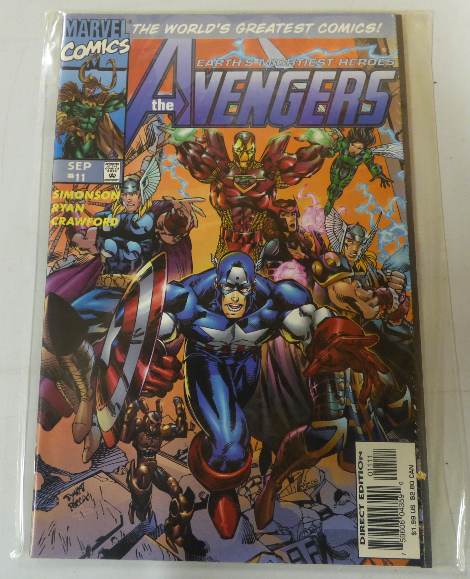 A multi-coloured Marvel Comics ‘The AVENGERS’ comic book, issue #11 from September, featuring ‘EARTH’S MIGHTIEST HEROES’ by SIMONSON RYAN CRAWFORD, marked ‘DIRECT EDITION’ with prices $1.99 US and $2.80 CAN.