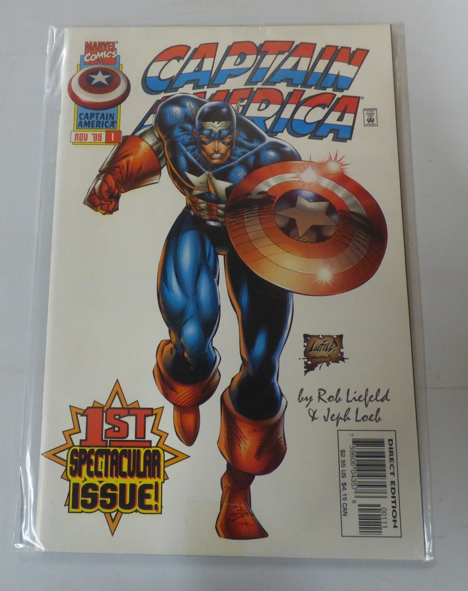A comic book titled “CAPTAIN AMERICA” by Marvel Comics, issue #1 from November 1996, featuring Captain America in blue, red, and orange on a white background, marked “1ST SPECTACULAR ISSUE!” and credited by Rob Liefeld & Jeph Loeb, priced at $2.95 US.