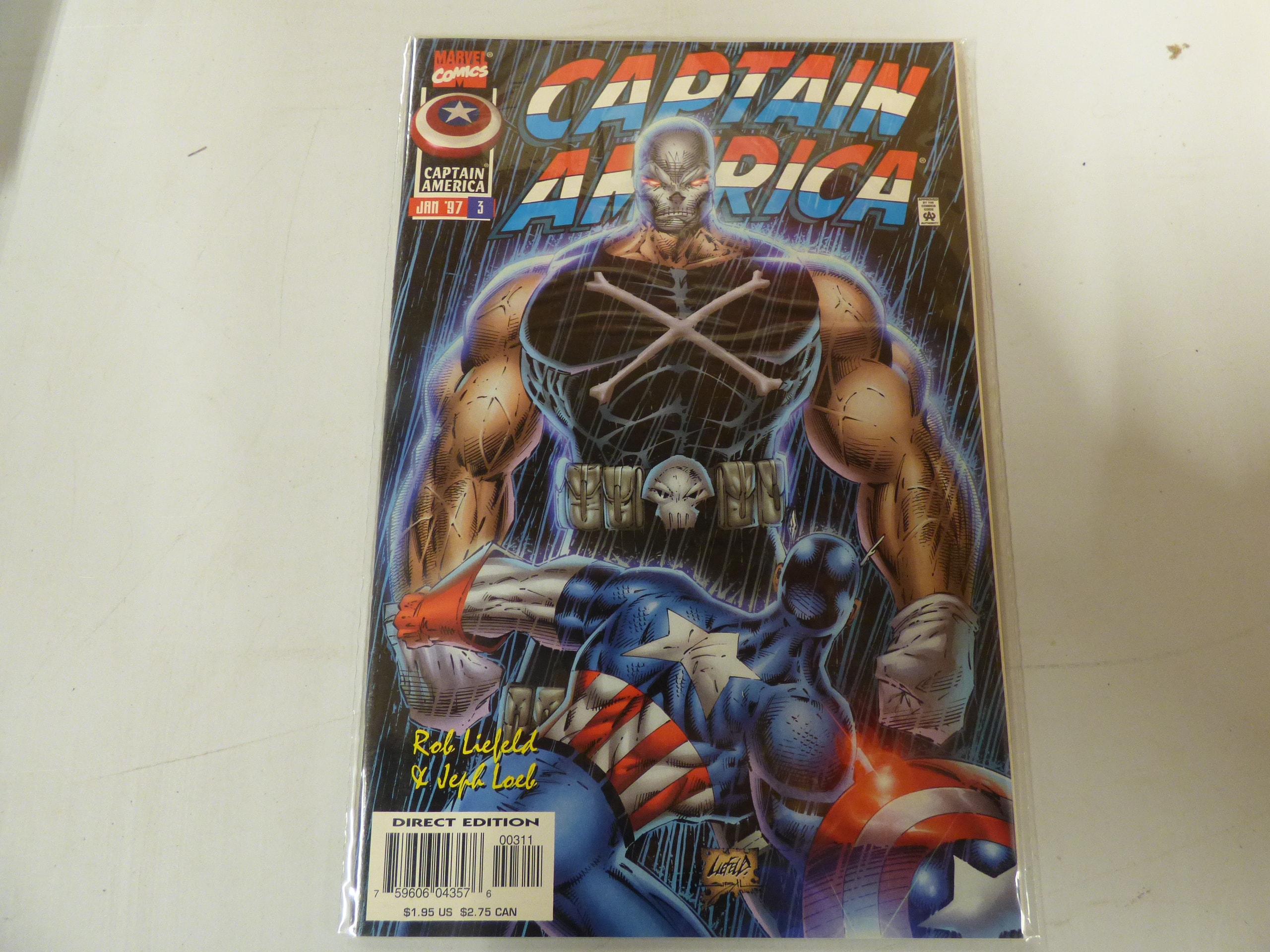 A multi-coloured Marvel Comics “Captain America” issue #3, dated January ’97, featuring art by Rob Liefeld and writing by Jeph Loeb, which is a Direct Edition priced at $1.95 US / $2.75 CAN.