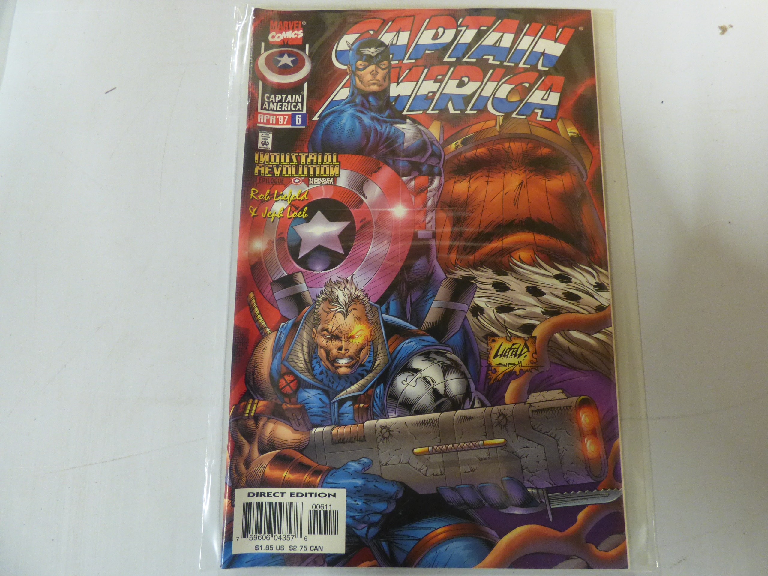 A single Captain America issue #6 comic book from April ’97 by Marvel Comics, featuring the ‘Industrial Revolution: Epilogue’ and ‘Heroes Reborn’ storyline, created by Rob Liefeld & Jeph Loeb, marked as a Direct Edition.