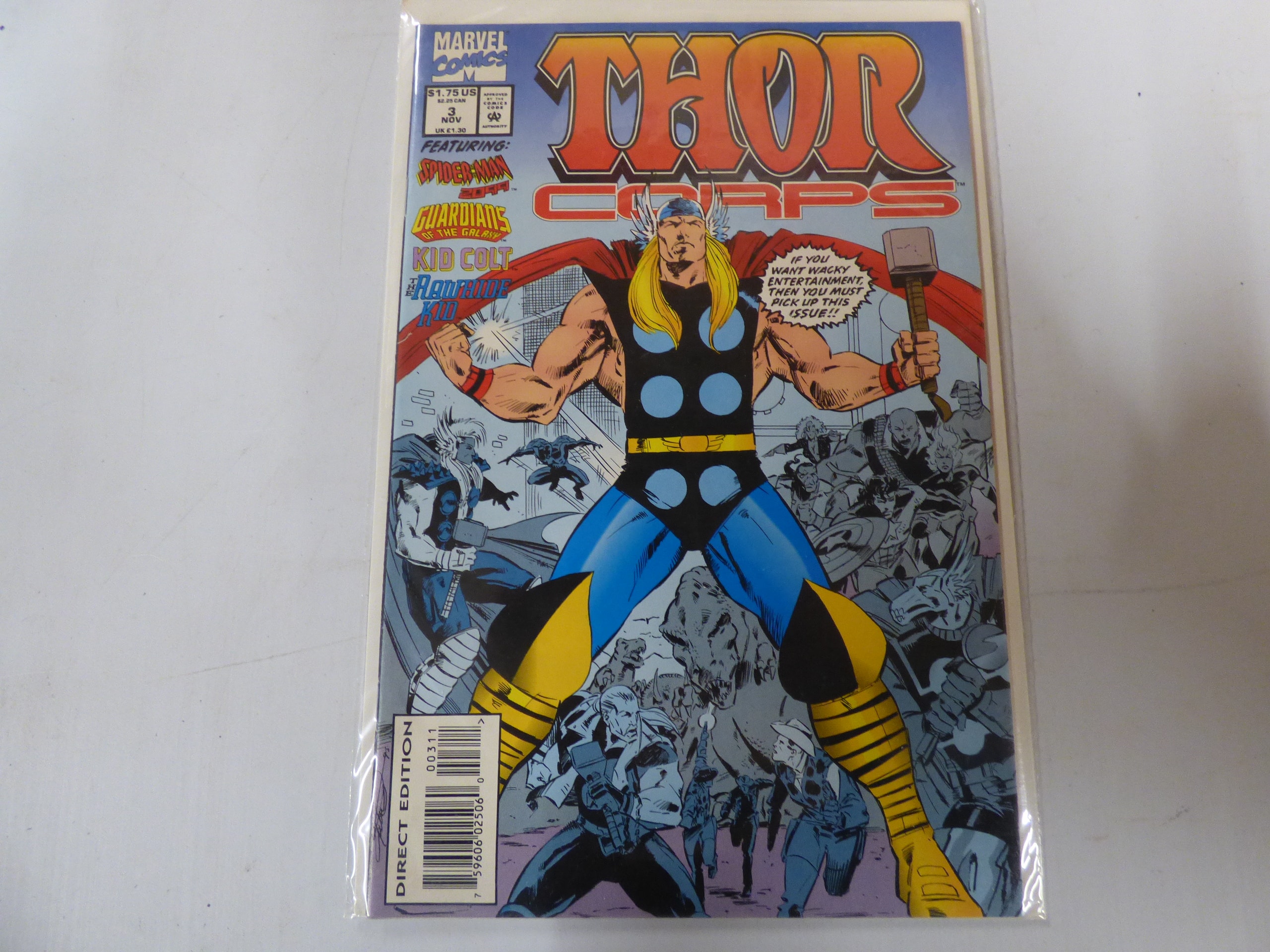 A Marvel Comics ‘THOR CORPS’ issue 3 from November, predominantly blue, yellow, and red, featuring ‘SPIDER-MAN 2099’, ‘GUARDIANS OF THE GALAXY’, ‘KID COLT’, and ‘THE RAWHIDE KID’, marked ‘DIRECT EDITION’ and ‘00311’.
