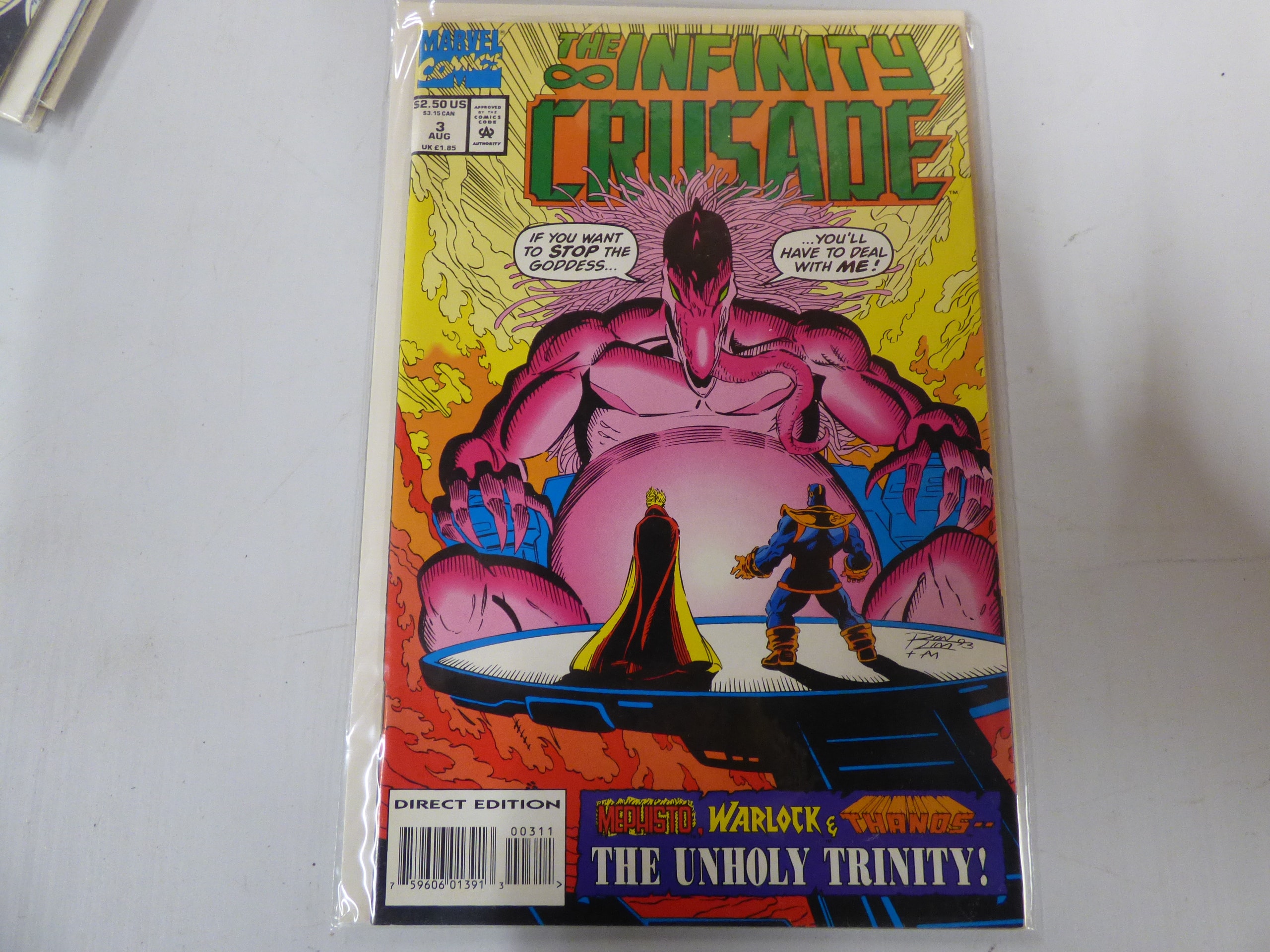** A Marvel Comics “The Infinity Crusade” issue #3 (August) featuring a pink creature with two smaller figures (one in black/yellow, one in blue/gold) on a colourful yellow/orange background, marked “DIRECT EDITION” and “MEPHISTO, WARLOCK & THANOS — THE UNHOLY TRINITY!” with a price of $2.50 US.