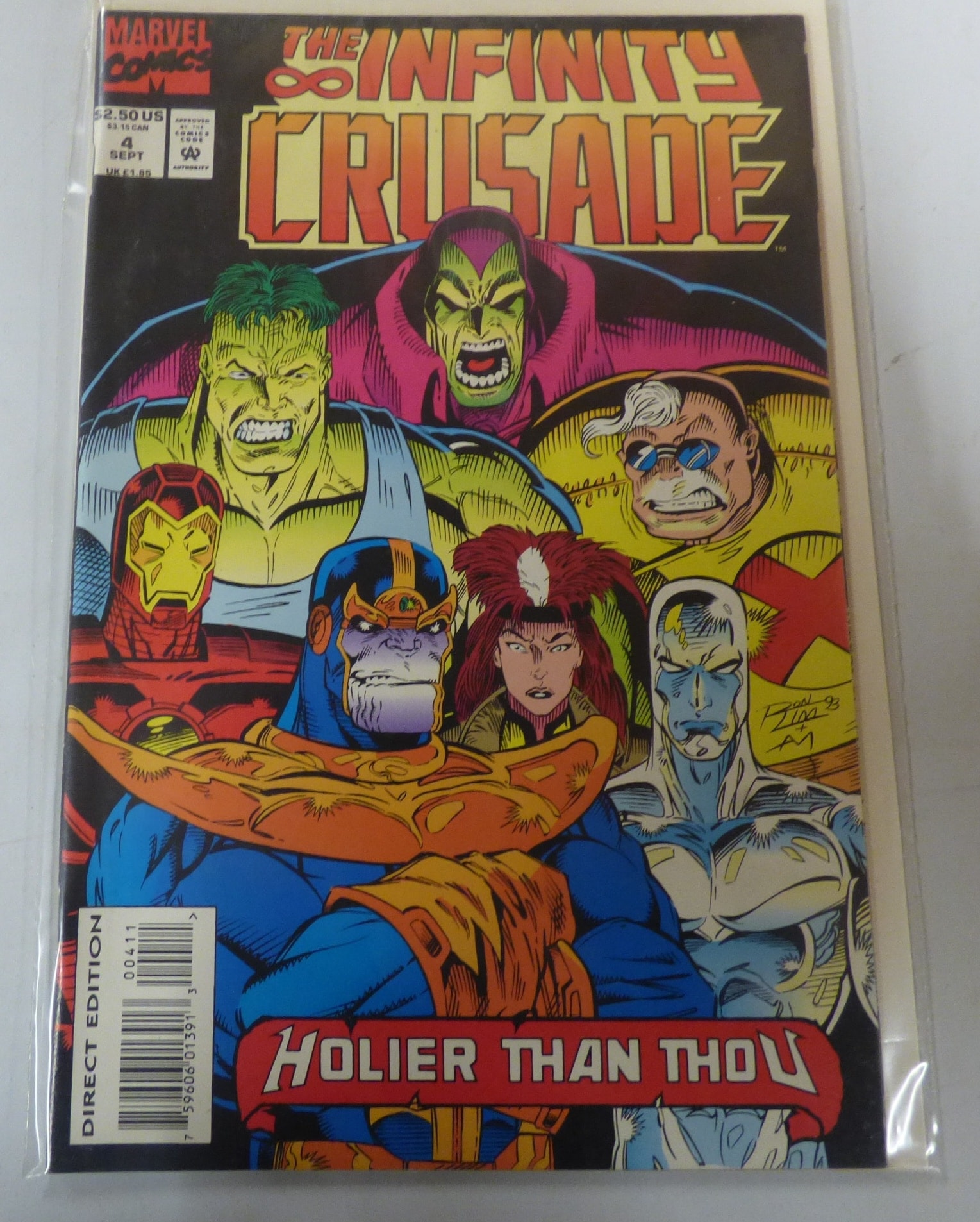 A Marvel comic book, “The Infinity Crusade” issue #4 from September, featuring a multi-coloured cover with Thanos, Iron Man, and Hulk, marked $2.50 US and “DIRECT EDITION” with “HOLIER THAN THOU” text.