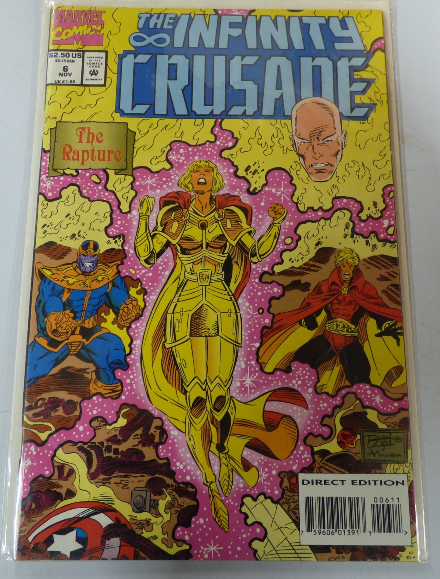 A Marvel Comics “The Infinity Crusade” comic book, issue #6, November, featuring a multi-coloured cover with “The Rapture” text, artist signatures “Bazooka ’99 + Milgrom”, and marked “DIRECT EDITION”.