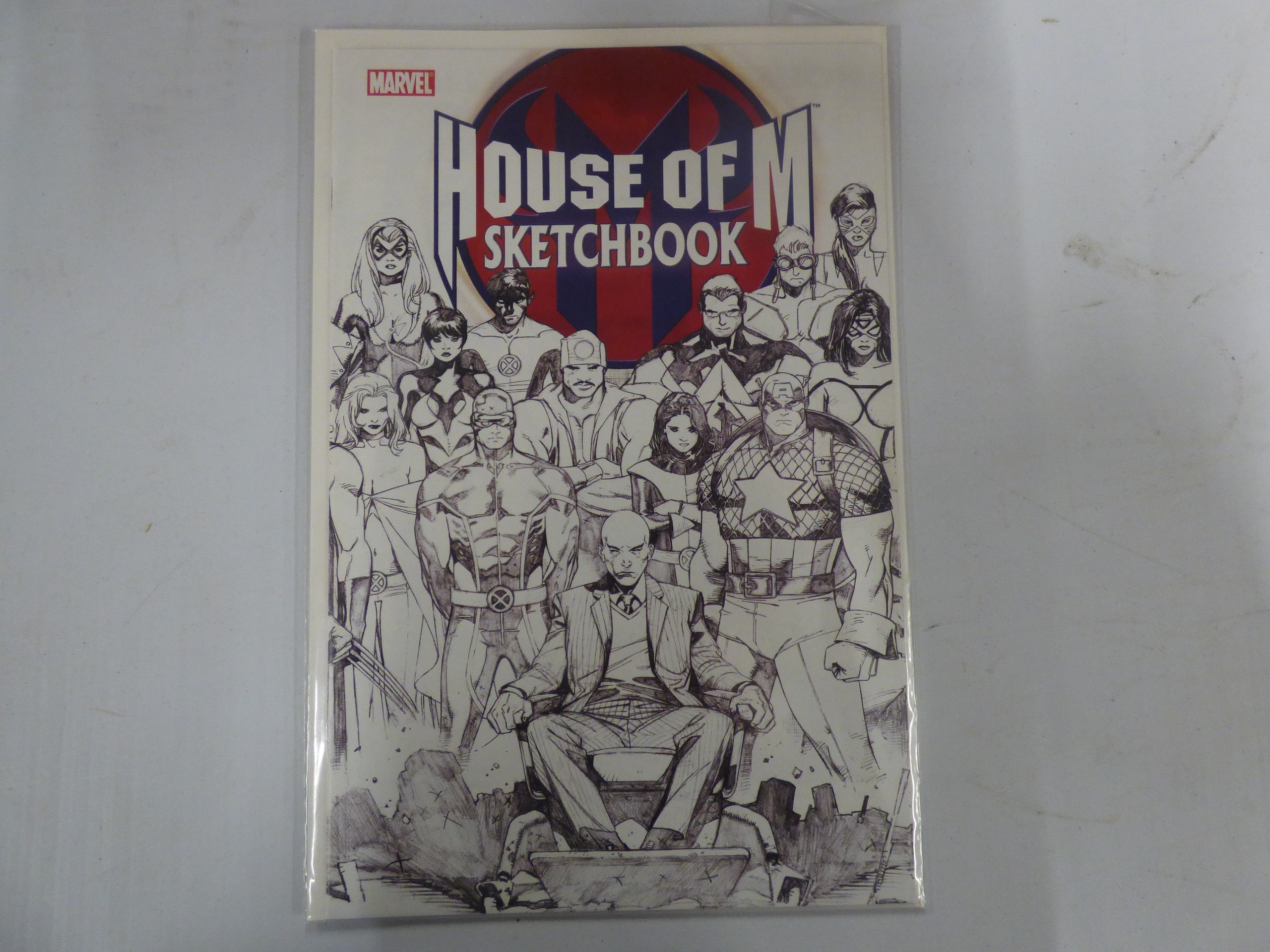 One comic book/sketchbook titled ‘HOUSE OF M SKETCHBOOK’ by MARVEL, featuring a white/cream cover with black line art of various characters and a prominent red and dark blue ‘M’ logo.