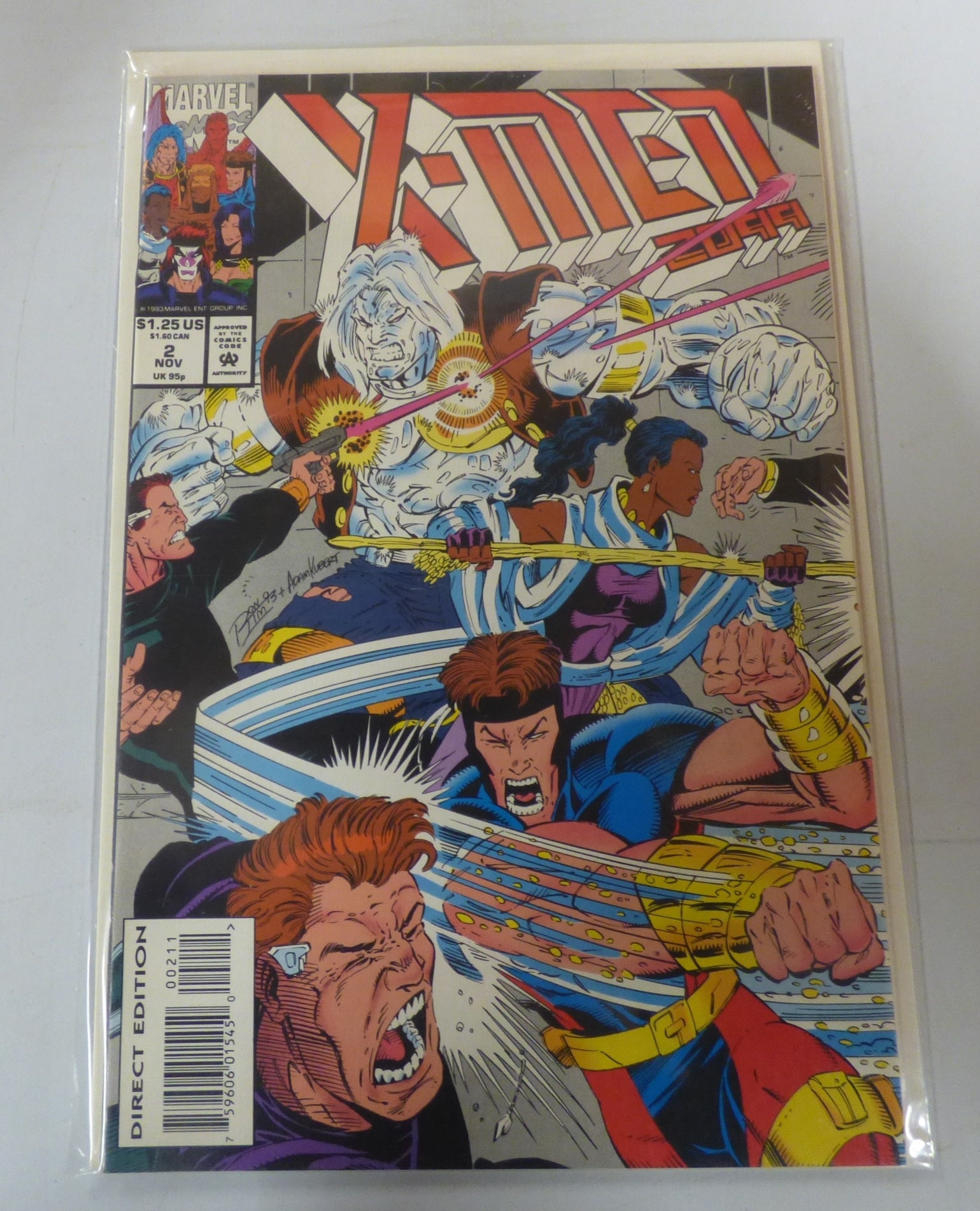 One Marvel X-Men 2099 comic book, issue #2, from November 1993, featuring colorful characters on the cover, marked $1.25 US, ‘DIRECT EDITION, ‘ and signed ‘Jim ’93 + Adam Kubert.’