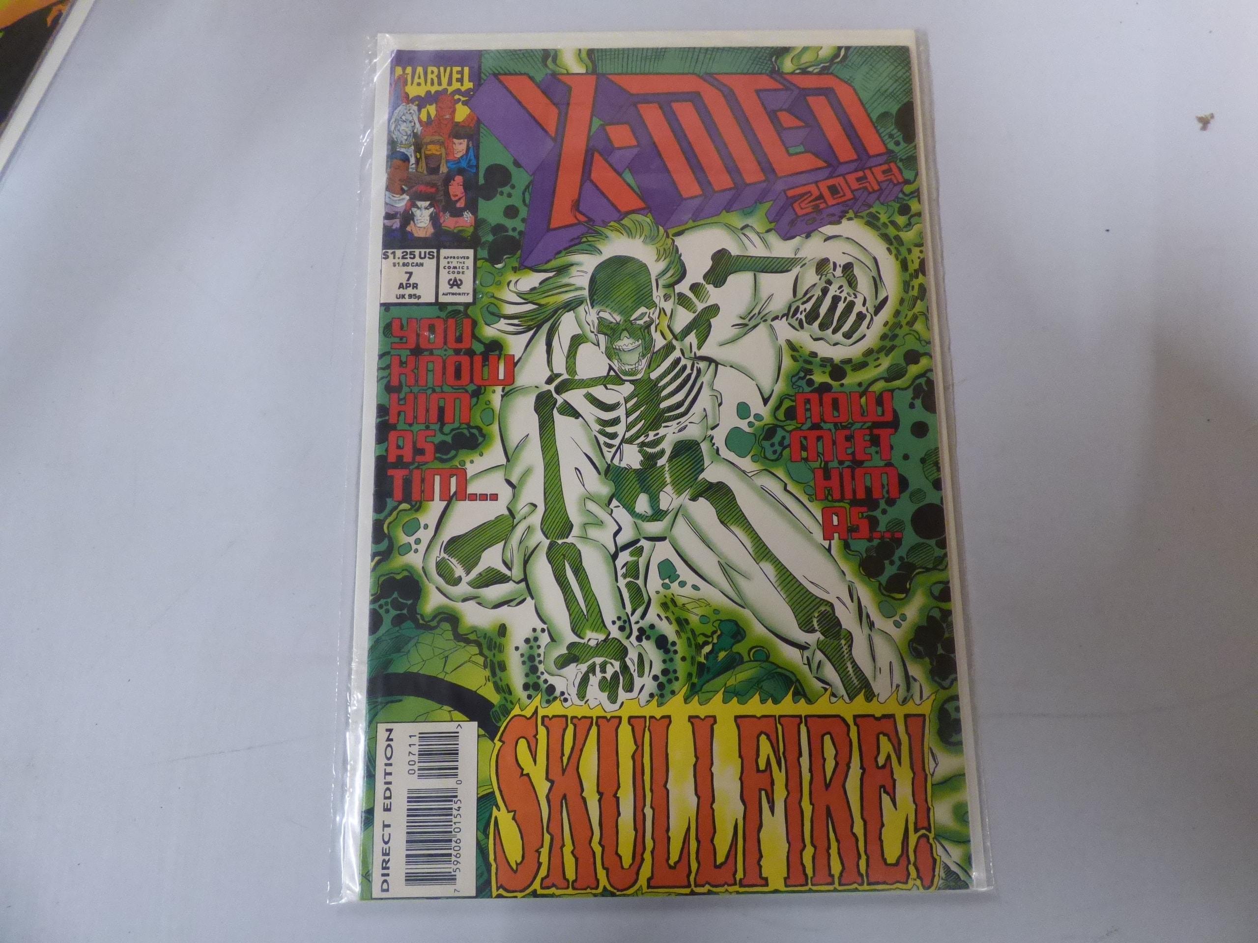 A Marvel X-Men 2099 comic book, issue #7 from April, features green, white, purple, and orange colors on its cover with text “MARVEL”, “X-MEN 2099”, “YOU KNOW HIM AS TIM…”, “NOW MEET HIM AS…”, “SKULLFIRE!”, and is priced at $1.25 US.