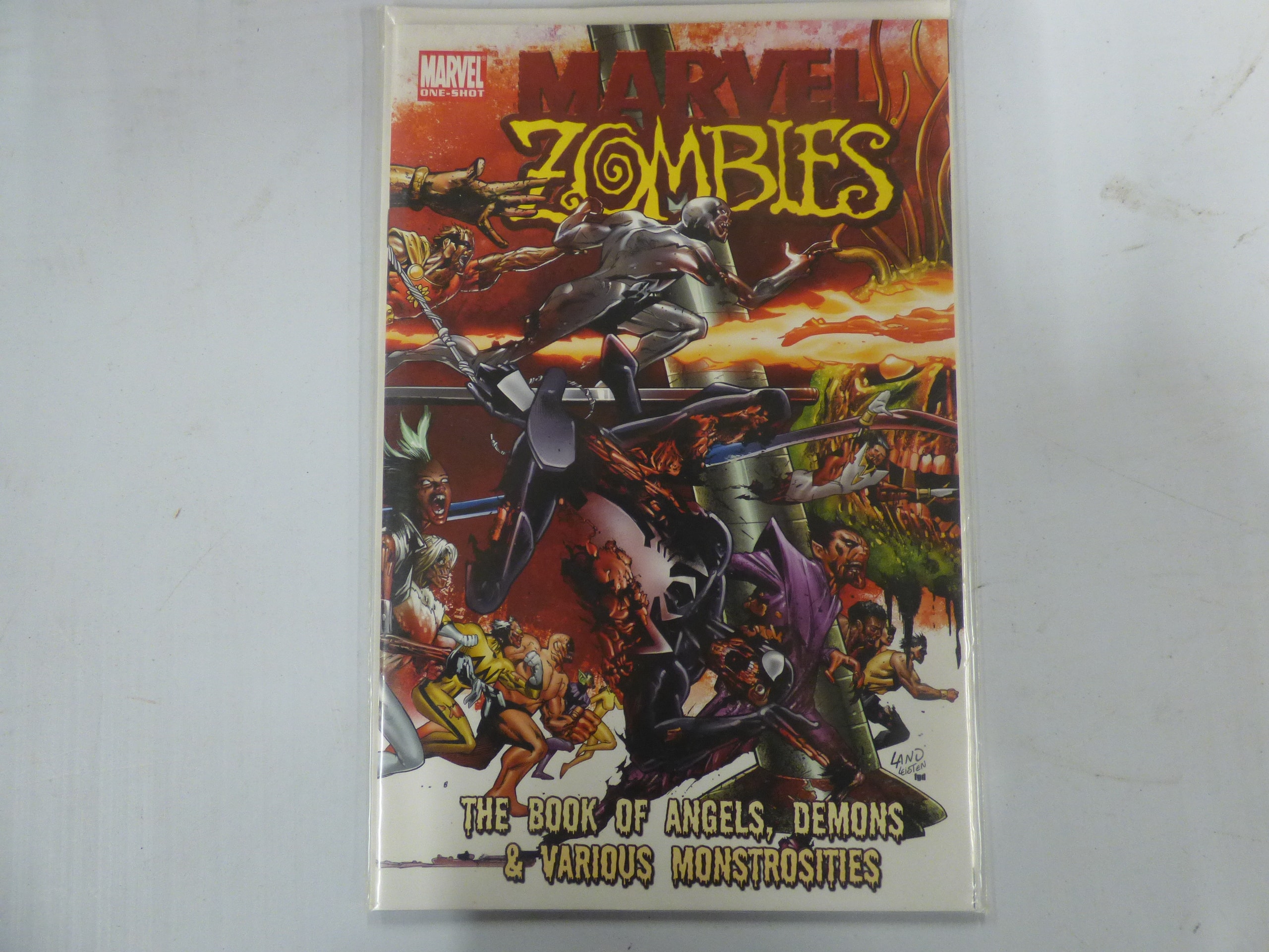 A single comic book titled ‘MARVEL ZOMBIES’ with a red, yellow, and black cover featuring ‘MARVEL ONE-SHOT’ and ‘THE BOOK OF ANGELS, DEMONS & VARIOUS MONSTROSITIES’, with visible artist signatures ‘LAND LEISTEN’.