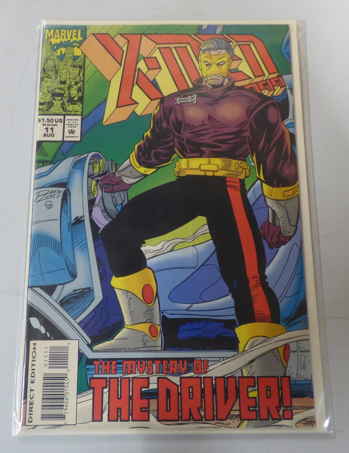 A Marvel Comics X-Men comic book, issue #11, dated August 1994, featuring a character in a maroon shirt and black pants with yellow and red accents against a green and blue background, titled “THE MYSTERY OF THE DRIVER!”, with a visible price of $1.50 US.