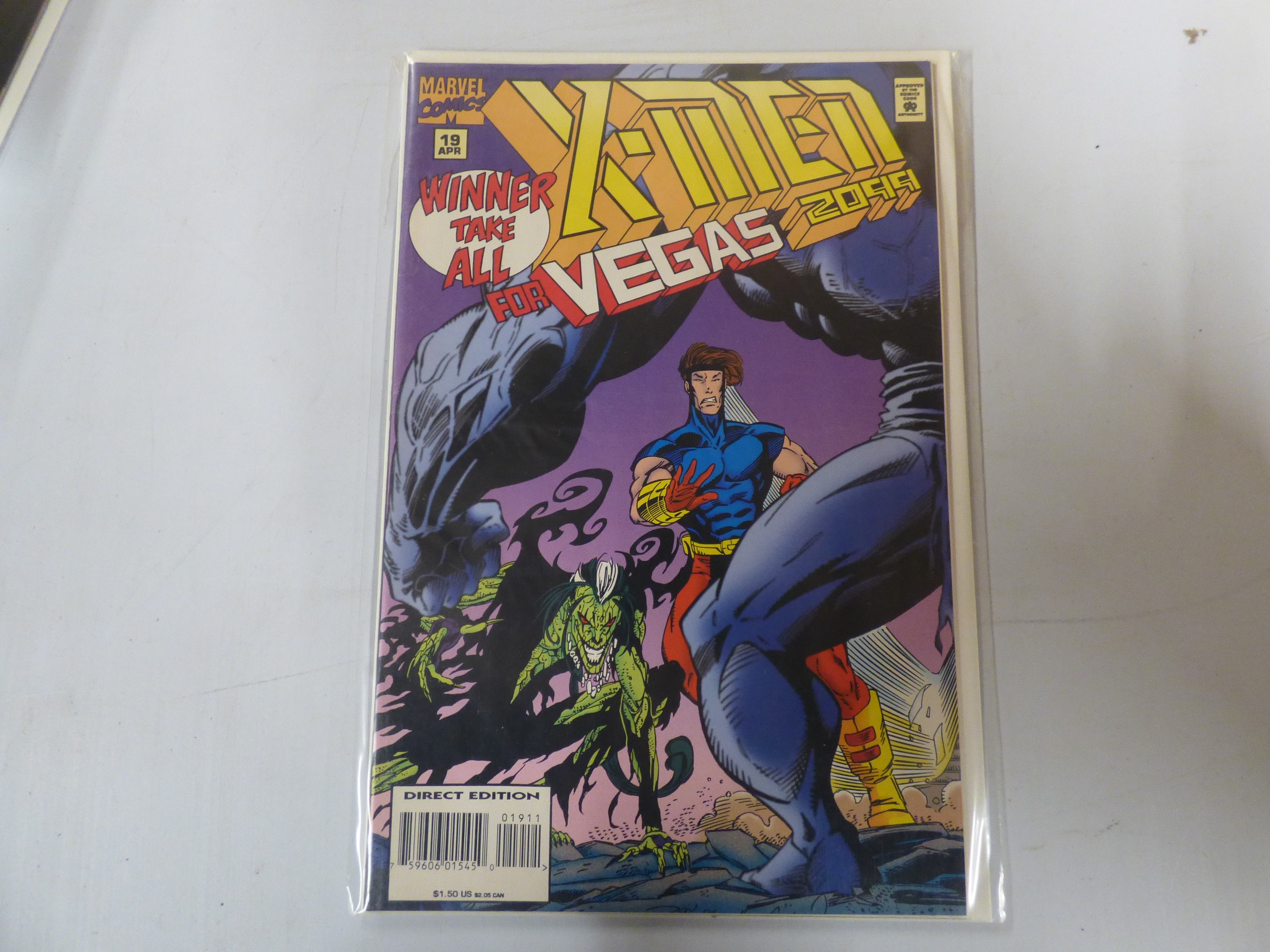A Marvel Comics X-Men 2099 comic book, issue #19 from April, titled “Winner Take All For Vegas, ” a DIRECT EDITION with main colors of purple, yellow, blue, red, green, and black.