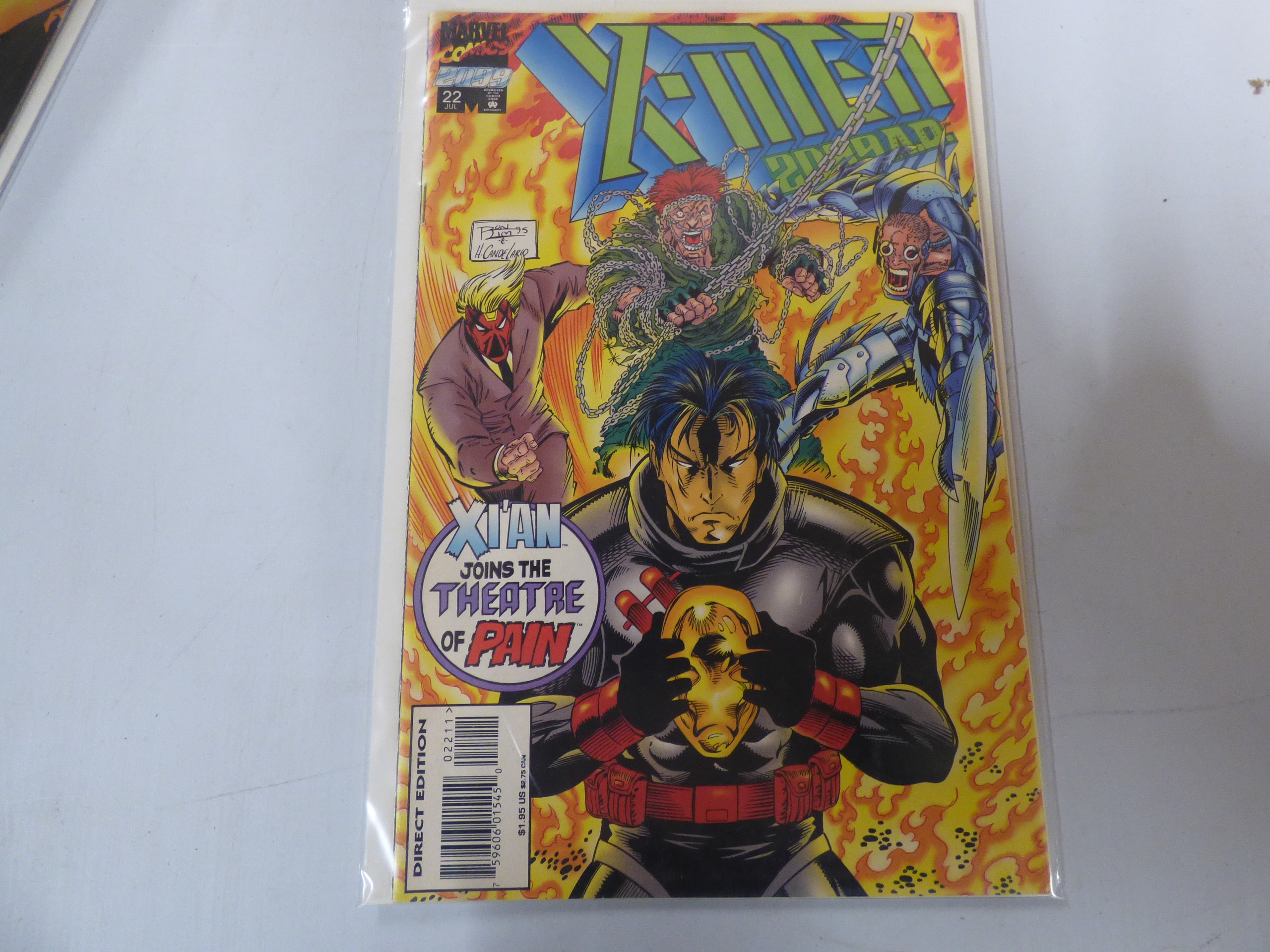 A Marvel Comics X-MEN 2099 #22 comic book, July issue, primarily yellow and orange with multi-colored characters, marked “DIRECT EDITION” and “XIAN JOINS THE THEATRE OF PAIN”, priced at $1.95 US / $2.75 CAN.