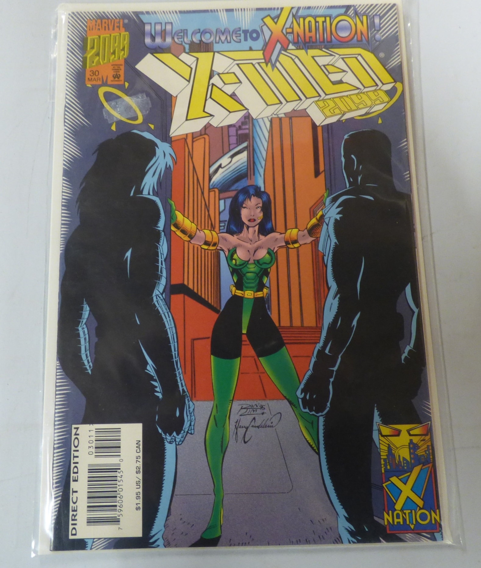 A Marvel X-Men 2099 comic book, issue #30, predominantly dark blue, yellow, green, and black, features ‘MARVEL 2099’, ‘WELCOME TO X-NATION!’, ‘X-MEN 2099’, ‘DIRECT EDITION’, and an ‘X-NATION’ logo on the cover.