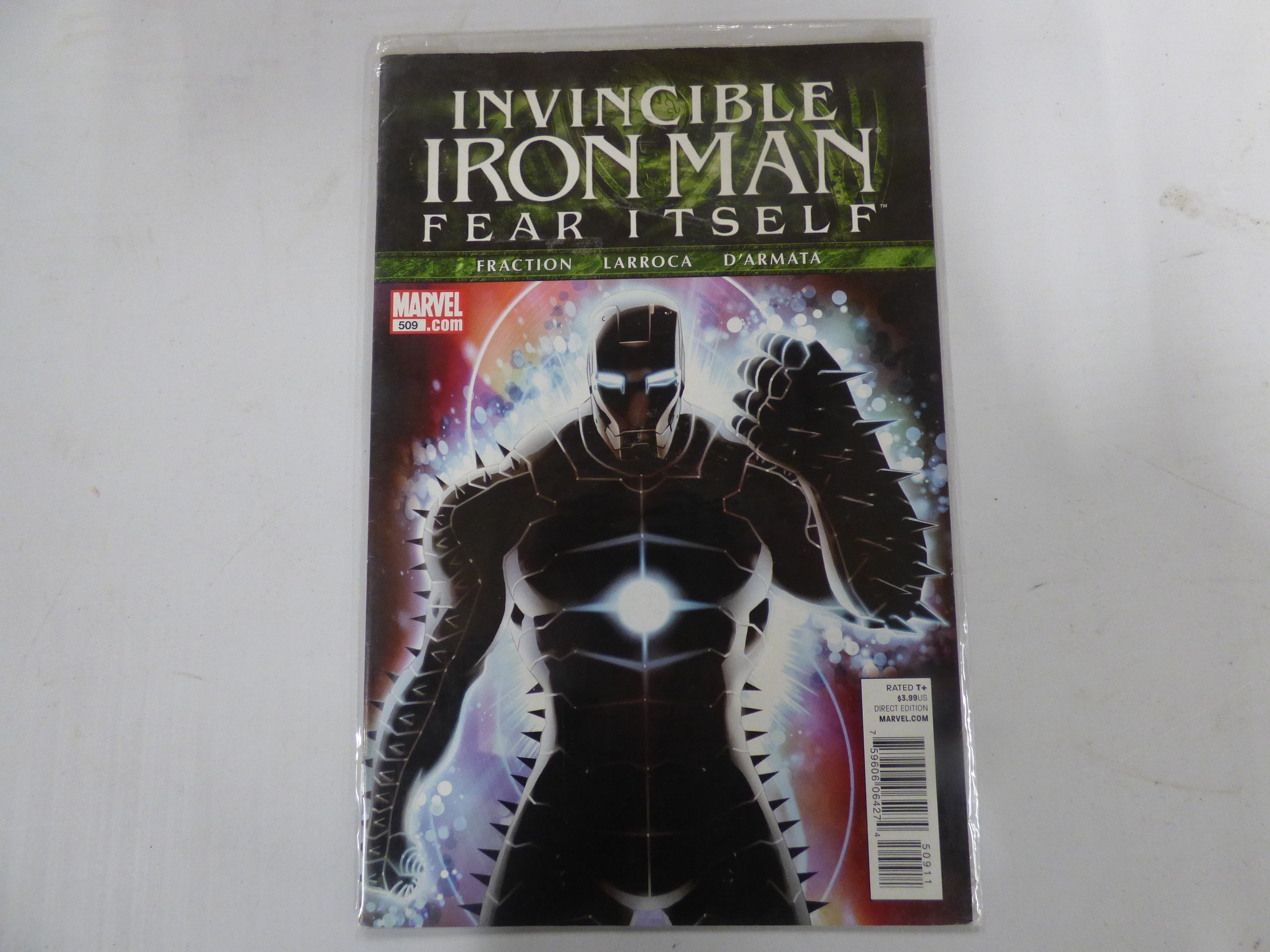 A comic book, “Invincible Iron Man: Fear Itself” #509, by Fraction, Larroca, and D’Armata, features a dark-armored Iron Man on its predominantly dark, purple, and blue cover, displaying “MARVEL”, “RATED T+”, “DIRECT EDITION”, and priced at $3.99US.