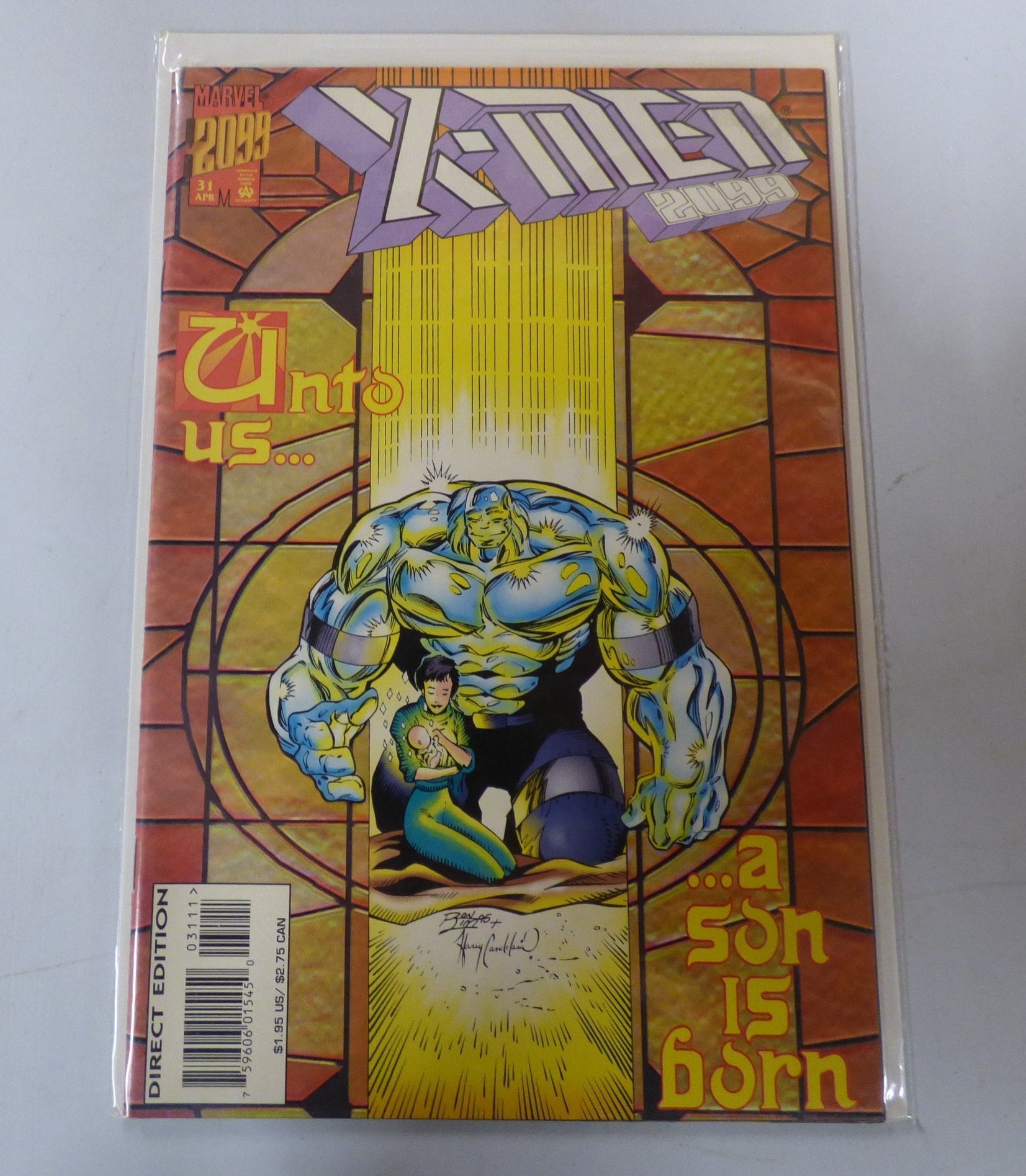 A multi-coloured Marvel ‘X-MEN 2099’ comic book, issue #31 (April), depicting a large blue and yellow figure with a woman holding a baby on the cover, featuring ‘Unto us… A SON IS BORN’, ‘DIRECT EDITION’, priced at $1.95 US / $2.75 CAN, with printed signatures ‘Ron Lim ’95 Harry Candelario’.