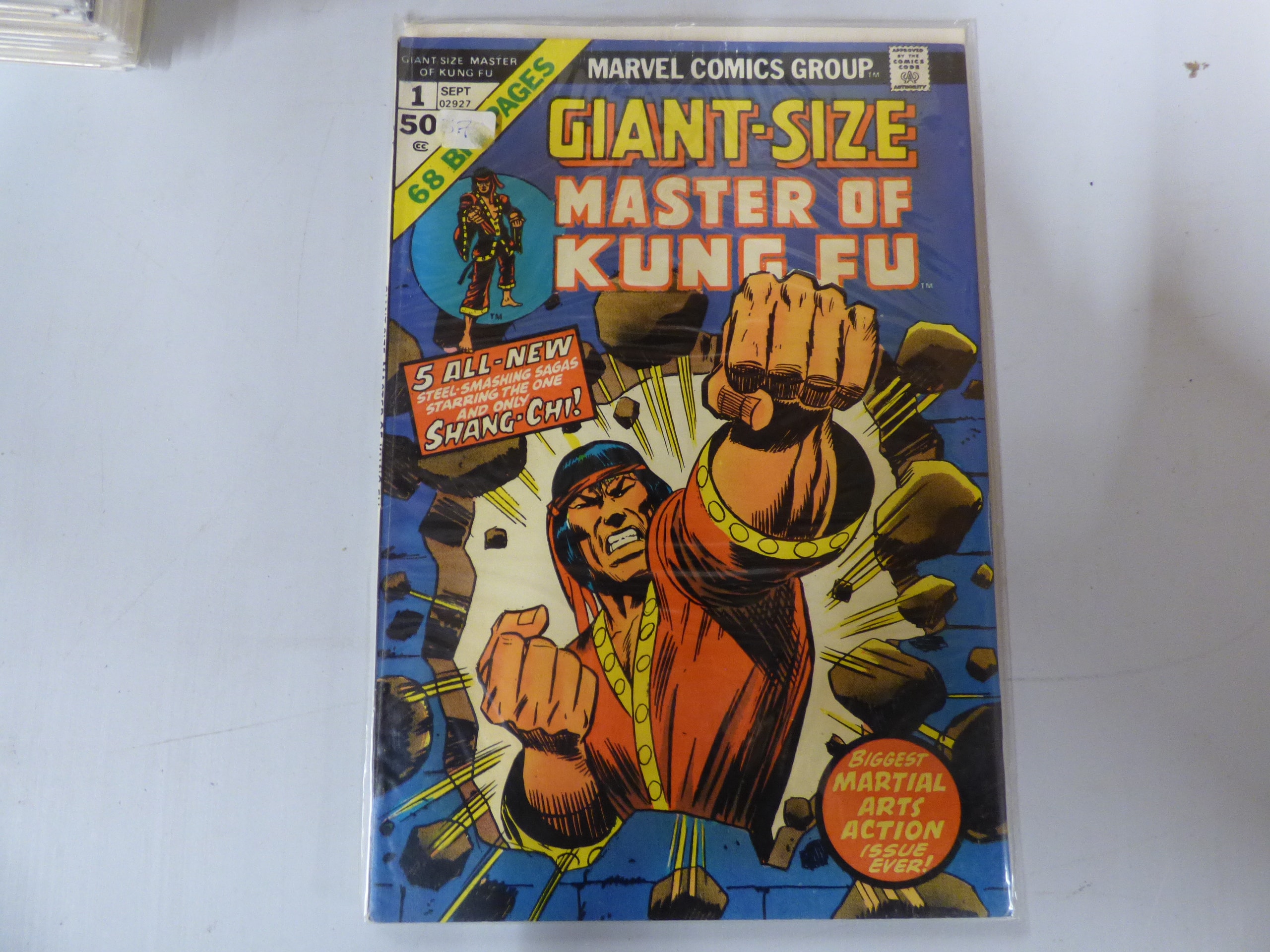 A multicoloured Marvel Comics Group “Giant-Size Master of Kung Fu” comic book, Issue #1 from September 1974, featuring Shang-Chi, with a 50¢ price, 68 B PAGES, and a Comics Code Authority seal.