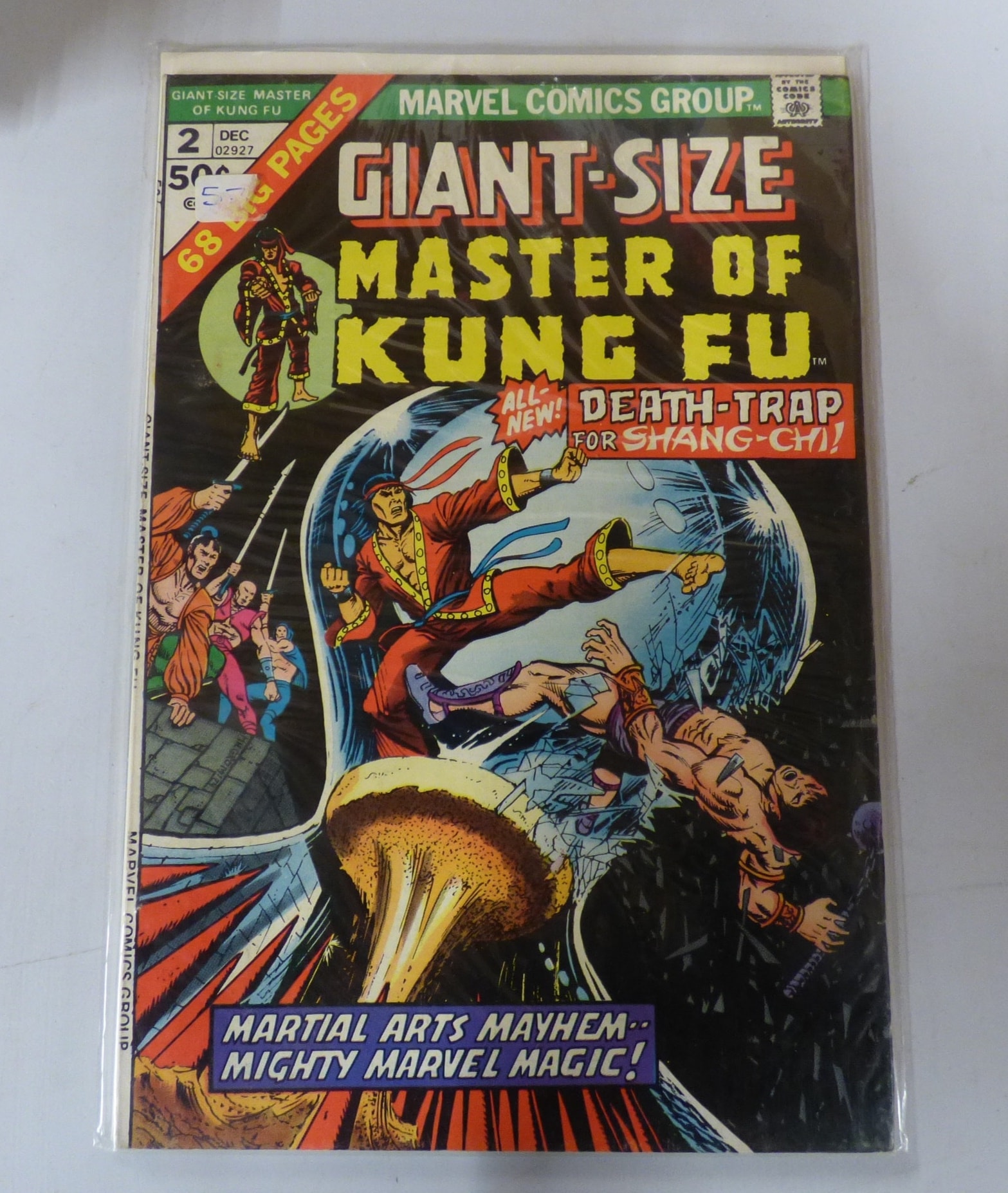 A Marvel Comics Group “Giant-Size Master of Kung Fu” comic book, issue #2 from December, features a dark background cover with yellow, red, and blue action scenes, showing a 50¢ cover price and a 5.- sticker price.