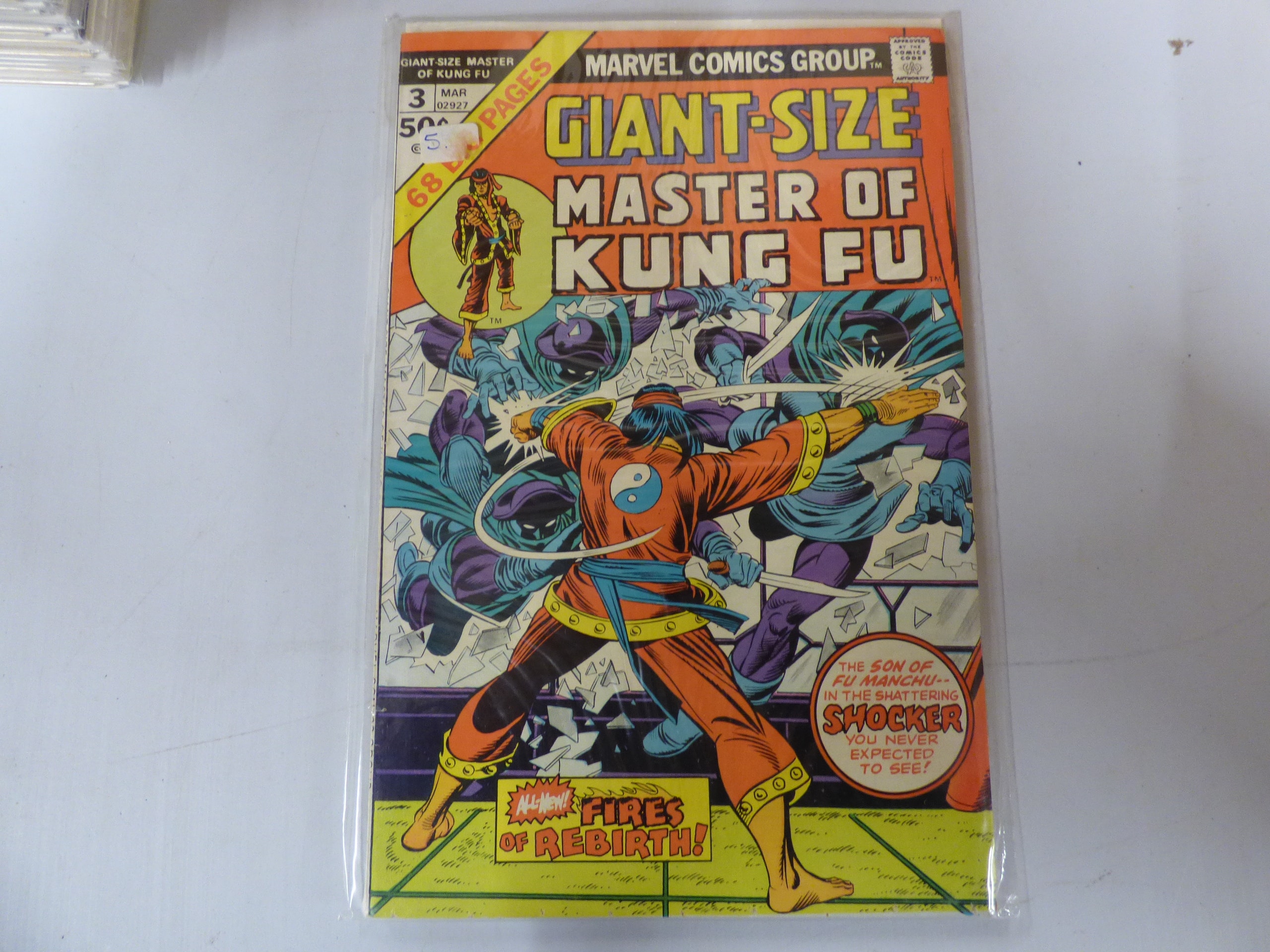 A single comic book, “Giant-Size Master of Kung Fu” issue #3, published March 1977 by Marvel Comics Group, featuring an orange, blue, purple, and yellow cover with a martial arts character, originally priced at 50¢.