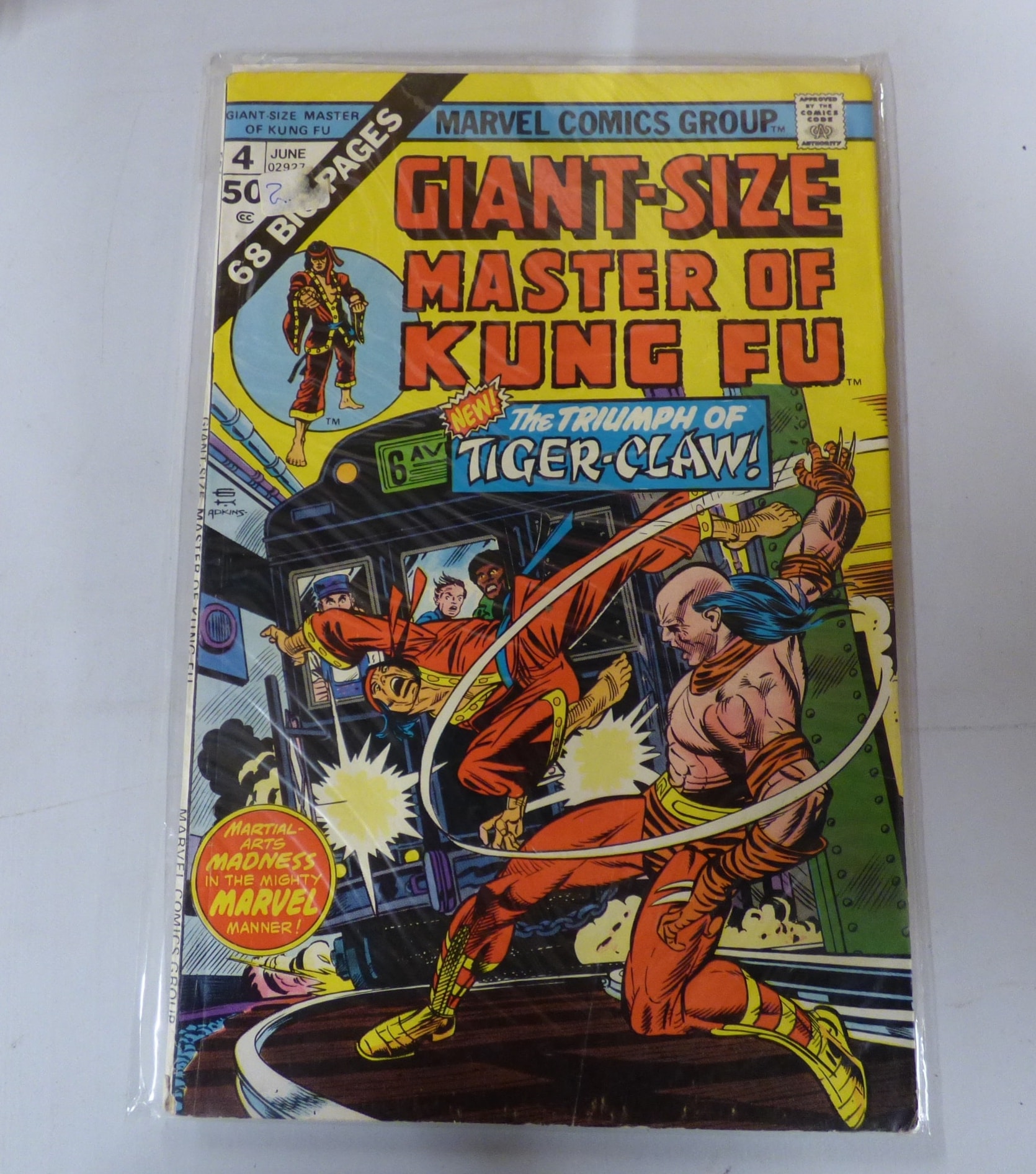 A multicolor Marvel Comics Group ‘Giant-Size Master of Kung Fu’ issue #4, priced at 50¢, featuring ‘The Triumph of Tiger-Claw!’ and ’68 Big Pages’.