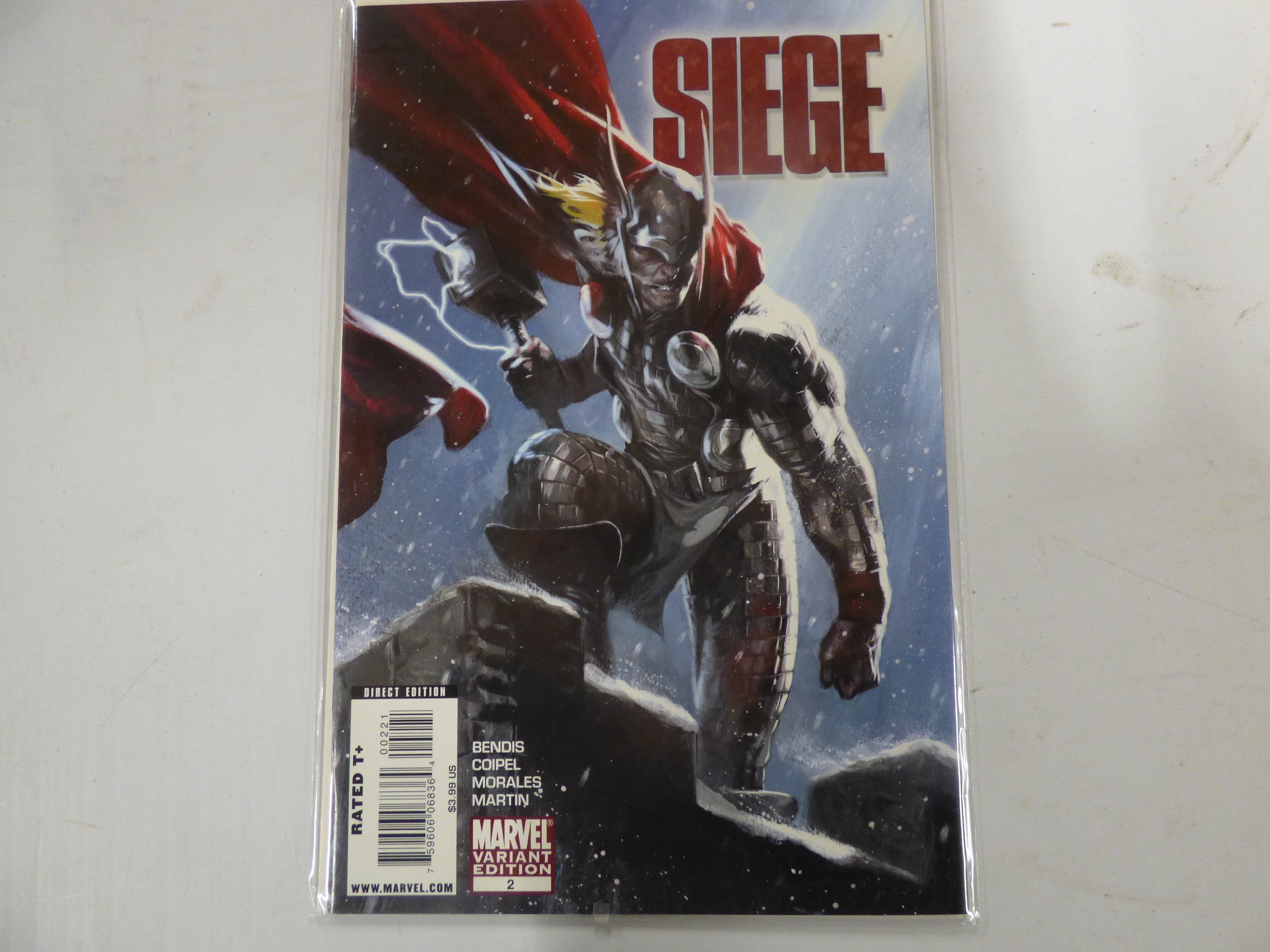 A comic book, “SIEGE” issue #2, a Marvel Variant Edition featuring Thor on the cover in metallic grey armor and a red cape against a blue and white background, marked as “DIRECT EDITION” and “RATED T+”, with creators Bendis, Coipel, Morales, and Martin, and a visible price of $3.99 US.