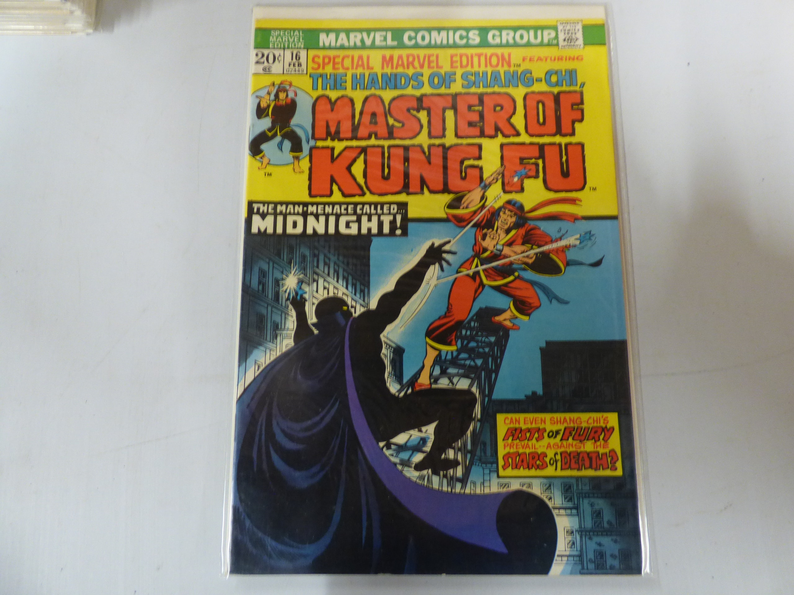 A single Marvel Comics Group ‘Special Marvel Edition featuring The Hands of Shang-Chi, Master of Kung Fu’ issue #16 comic book from February, with a 20¢ cover price and a yellow, blue, black, and red cover depicting Shang-Chi fighting Midnight.