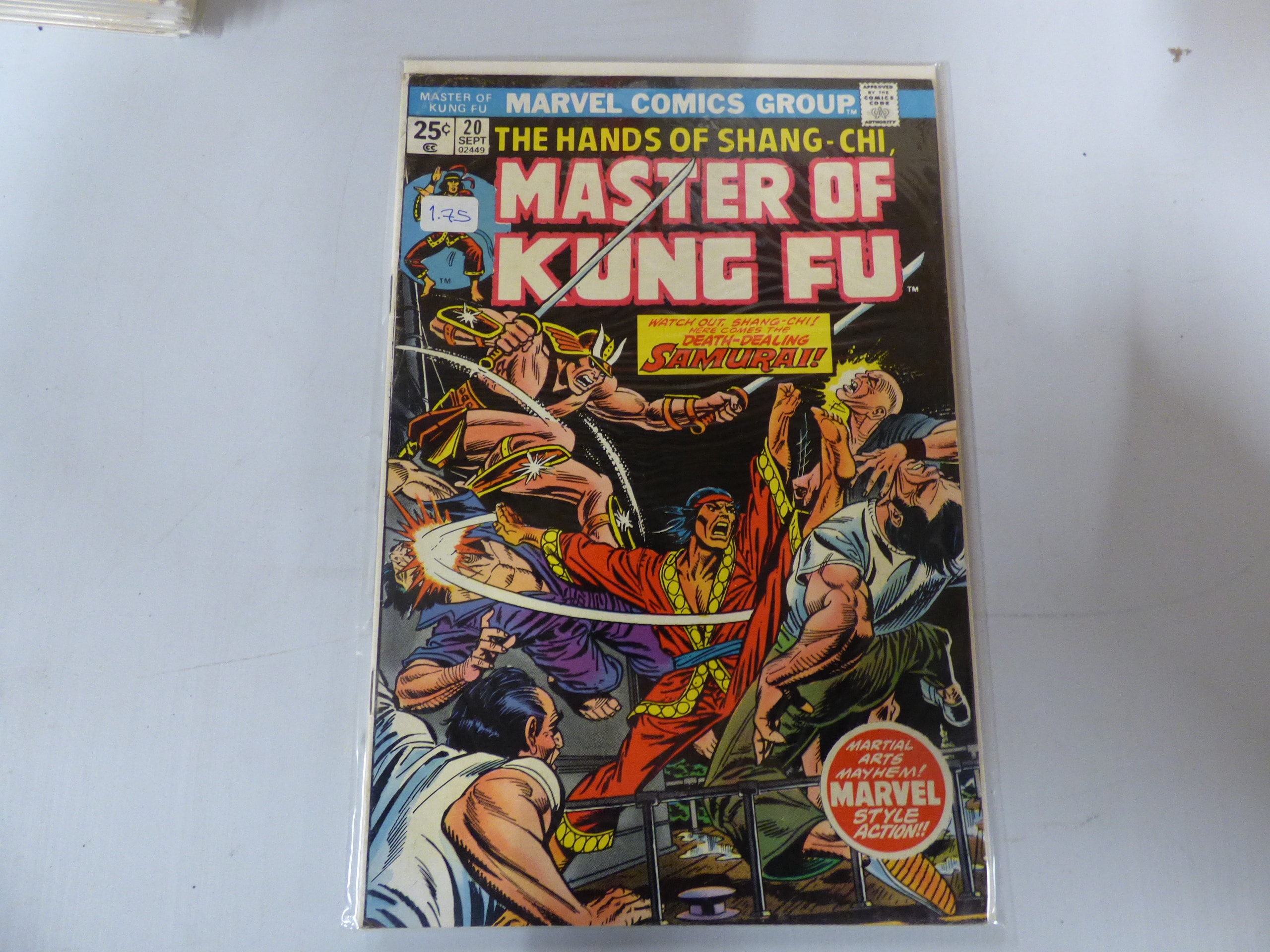A multi-coloured Marvel Comics Group “Master of Kung Fu” comic book, issue #20 from September, featuring “The Hands of Shang-Chi” and “The Death-Dealing Samurai!”, with a visible price of $1.75.