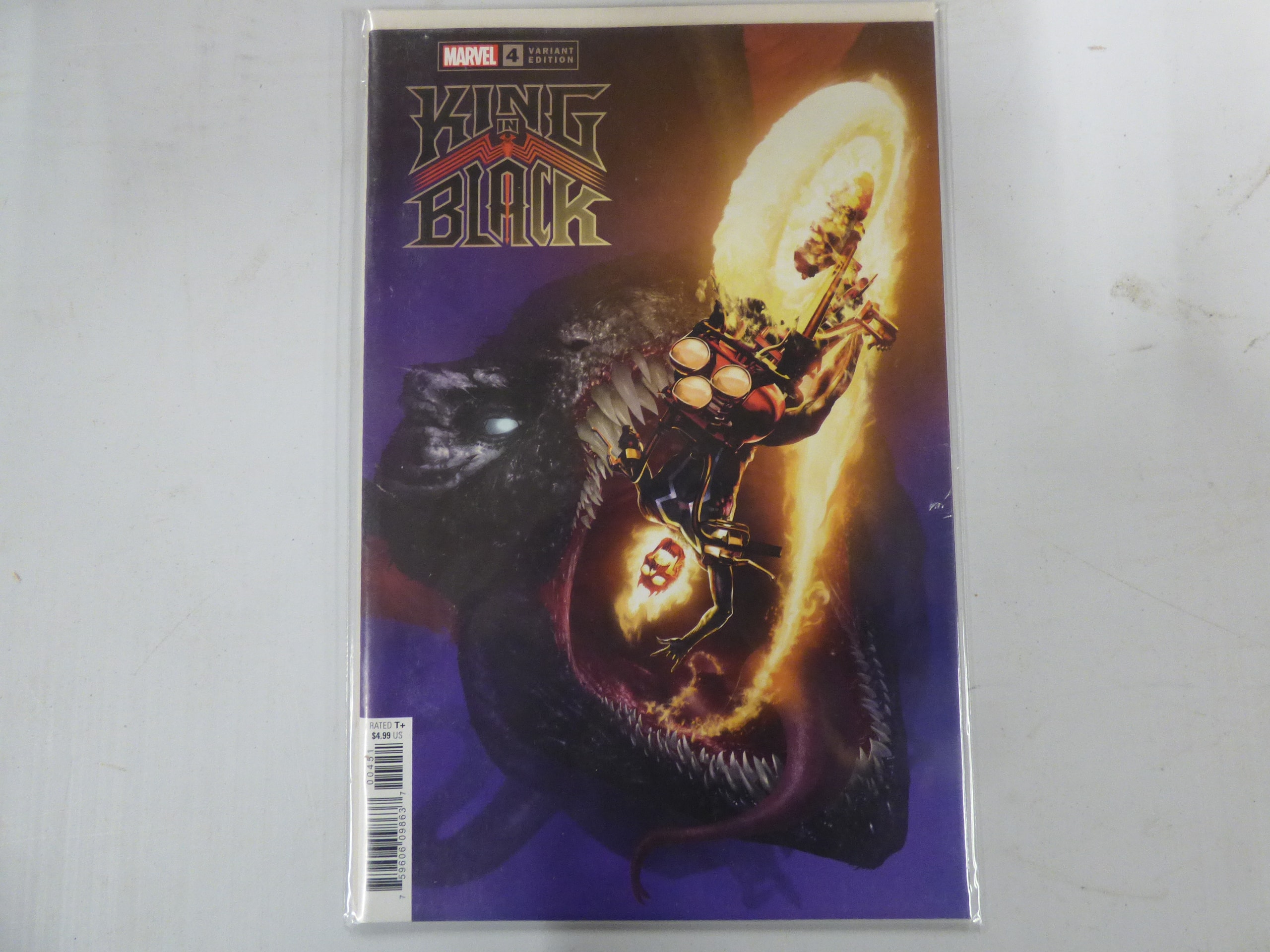 A Marvel comic book titled ‘KING IN BLACK’ #4, a Variant Edition with a dark purple, black, and orange cover, marked ‘MARVEL’, ‘RATED T+’, and priced at $4.99 US.
