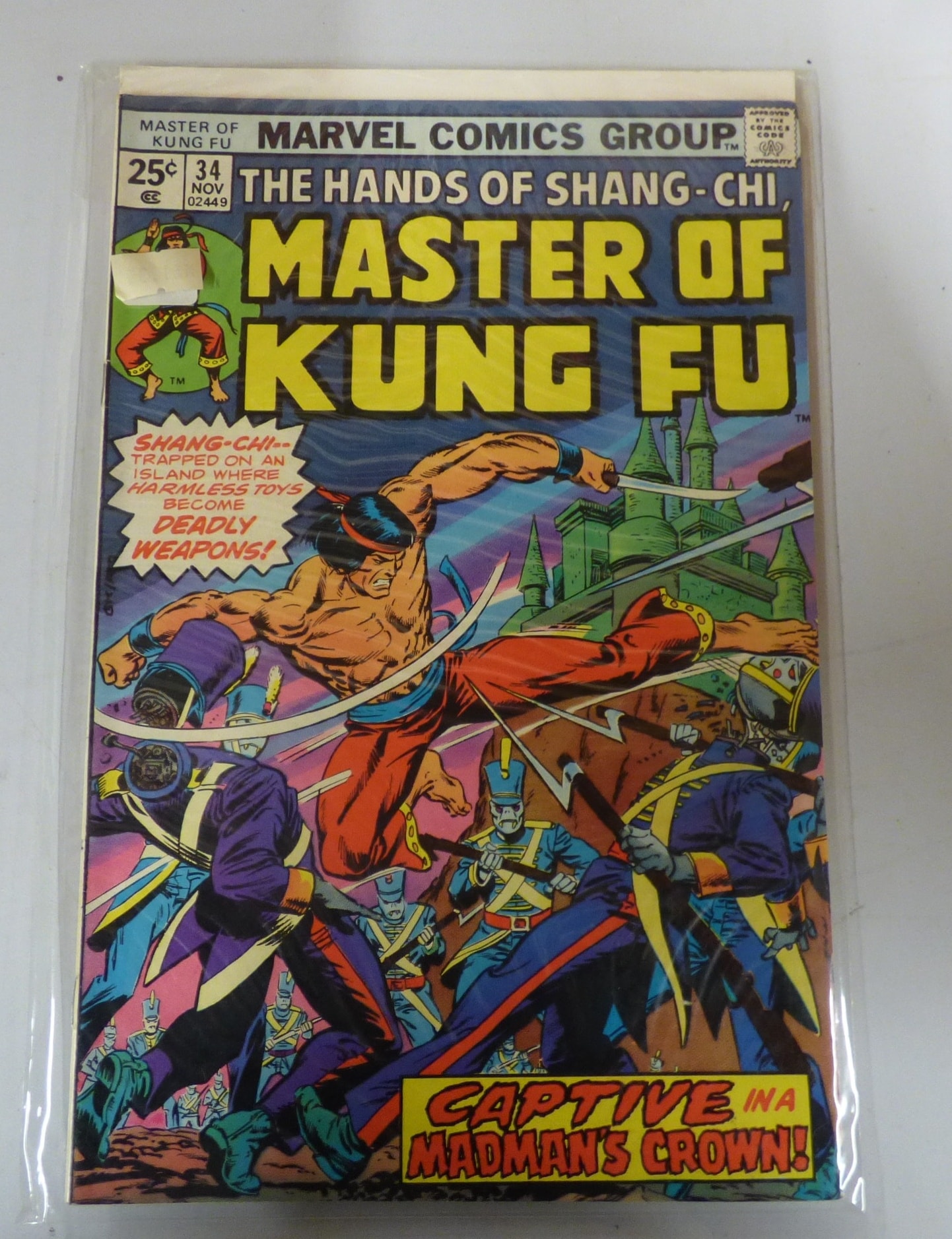 One multi-coloured Marvel Comics Group Master of Kung Fu comic book, issue #34, dated NOV, originally priced 25¢, with cover text ‘SHANG-CHI– TRAPPED ON AN ISLAND WHERE HARMLESS TOYS BECOME DEADLY WEAPONS!’ and ‘CAPTIVE IN A MADMAN’S CROWN!’.