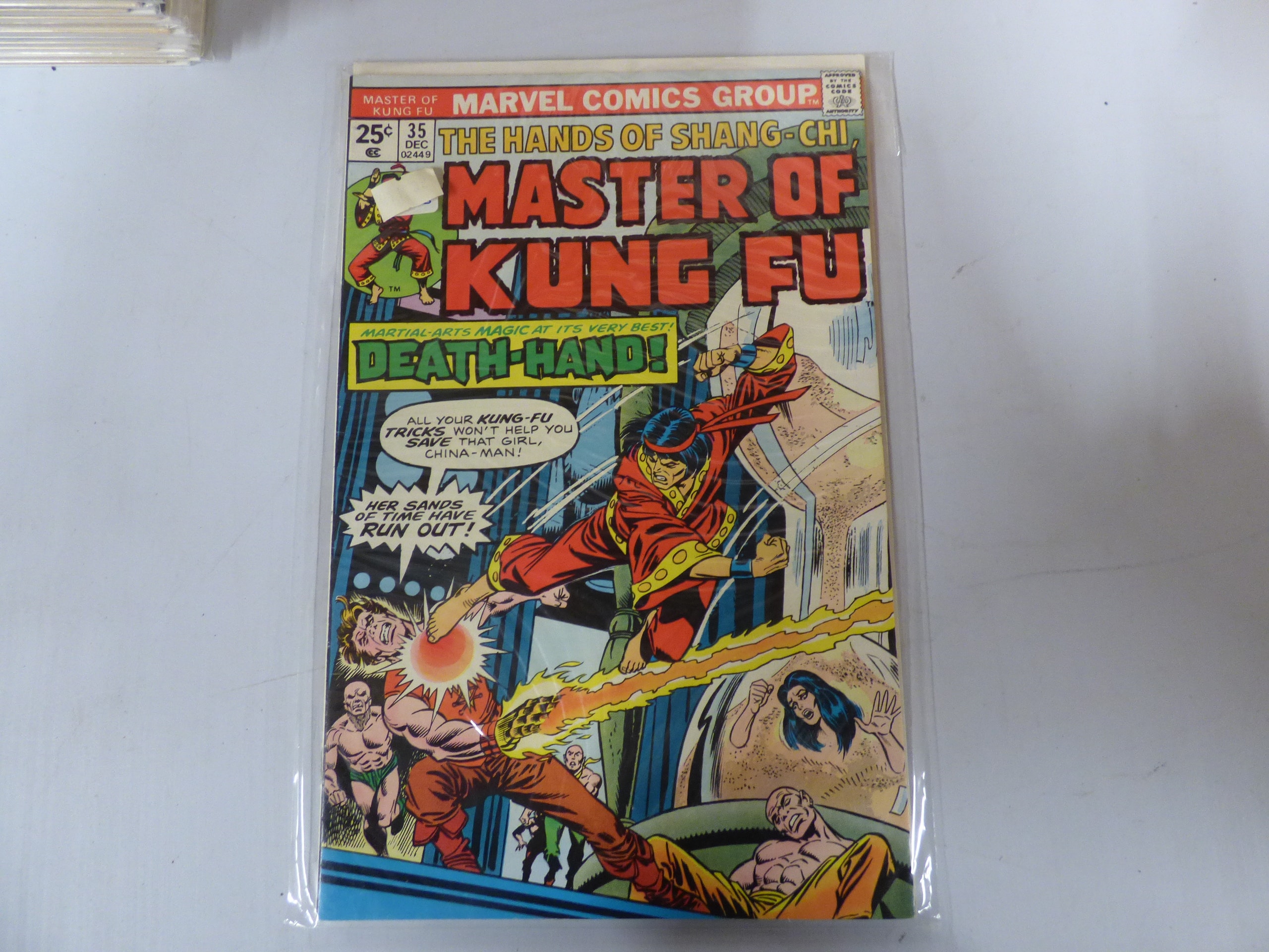 A single Marvel Comics Group ‘Master of Kung Fu’ #35 comic book with a red, yellow, and blue martial arts cover, originally priced at 25¢.