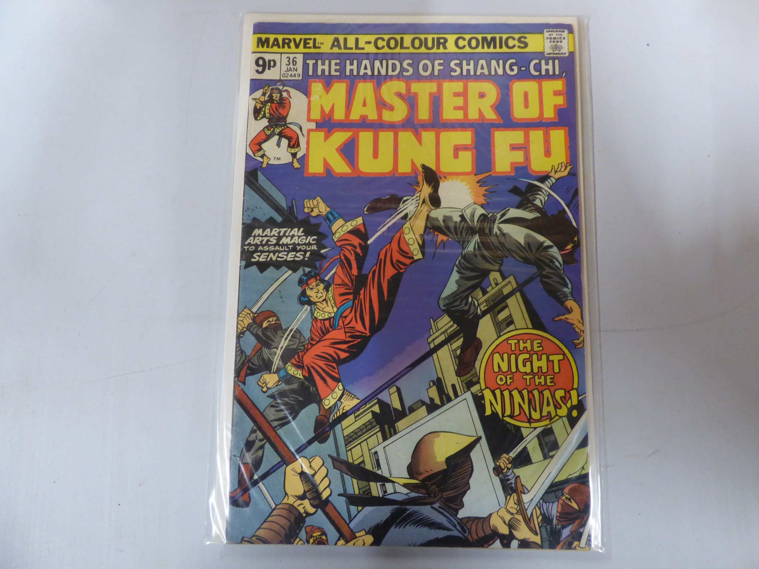 A Marvel™ All-Colour Comics “The Hands of Shang-Chi, Master of Kung Fu” comic book, issue #36 (JAN 02449), predominantly blue/purple and yellow, originally priced at 9p.