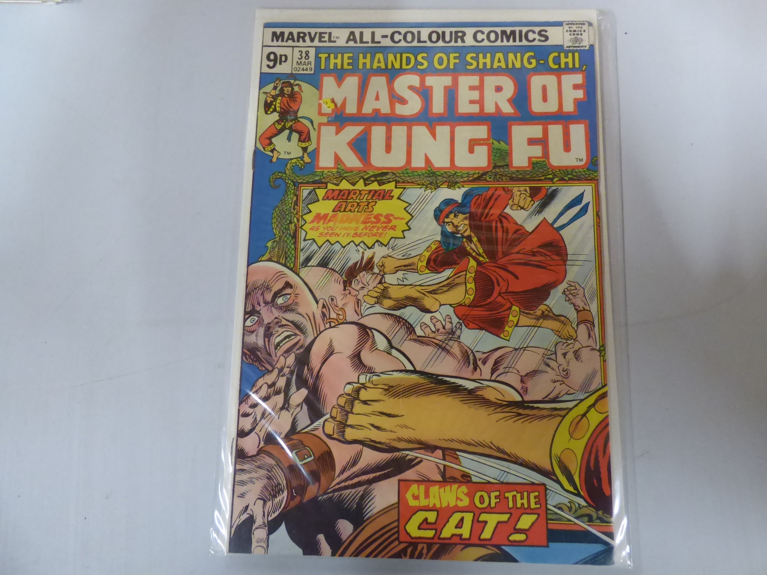 One Marvel All-Colour Comics “The Hands of Shang-Chi, Master of Kung Fu” comic book, issue #38 from March, primarily colored blue, red, and orange/yellow, with a visible price of 9p and a sticker showing £2.00.