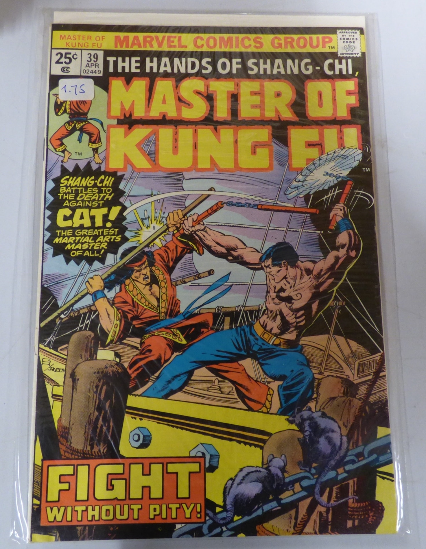 A multi-coloured Marvel Comics Group ‘Master of Kung Fu’ comic book, issue #39 (APR, 25¢, code 02449), titled ‘The Hands of Shang-Chi’ with taglines ‘Shang-Chi Battles to the Death Against Cat!’ and ‘Fight Without Pity!’, approved by the Comics Code Authority, and bearing a sticker price of $1.75.