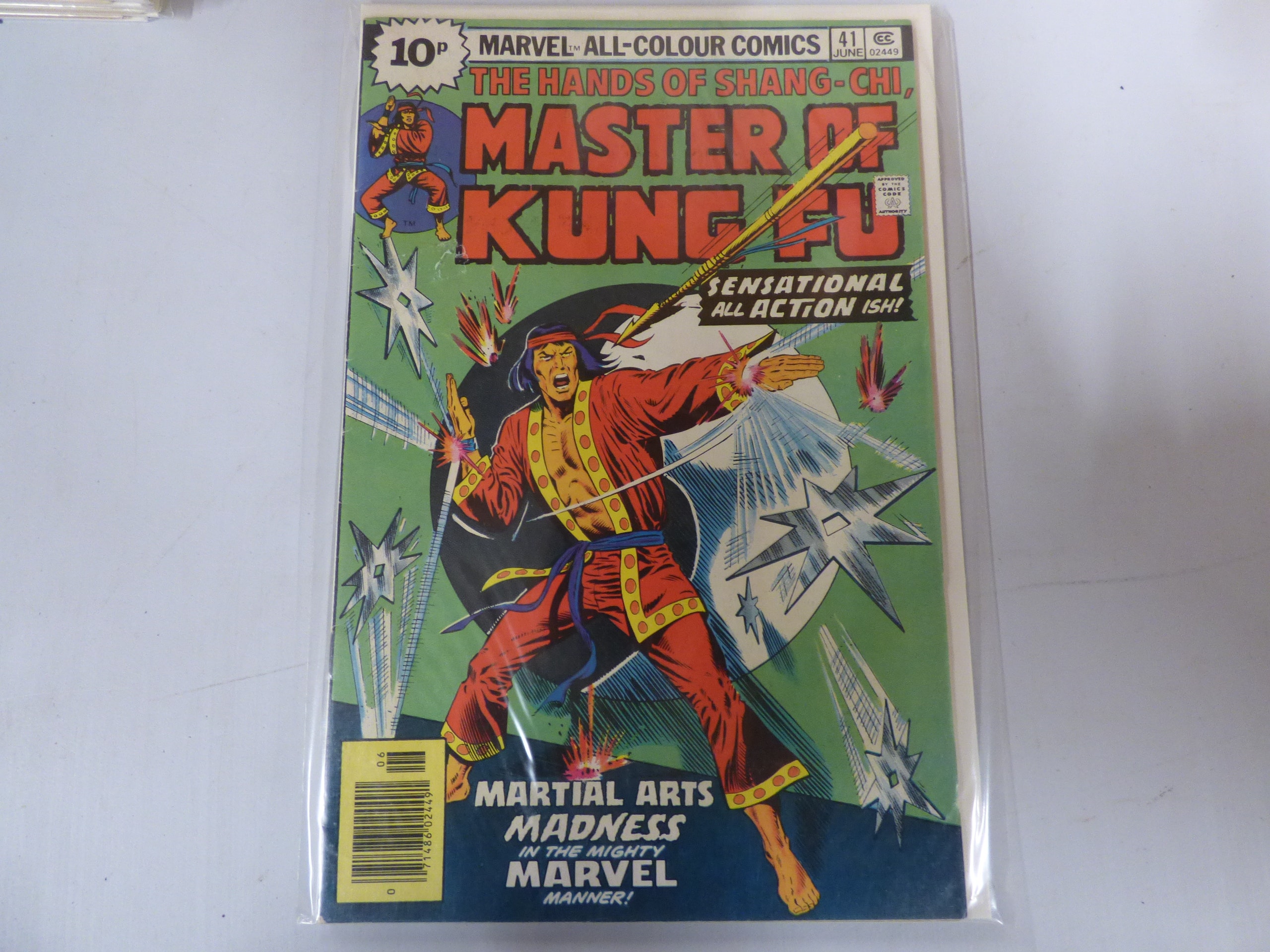 A Marvel All-Colour Comics The Hands of Shang-Chi, Master of Kung Fu #41 comic book, published in June, featuring a dynamic green, red, and blue cover with ‘SENSATIONAL ALL ACTION ISH!’, Comics Code Authority seal, and UPC 71486 02449.