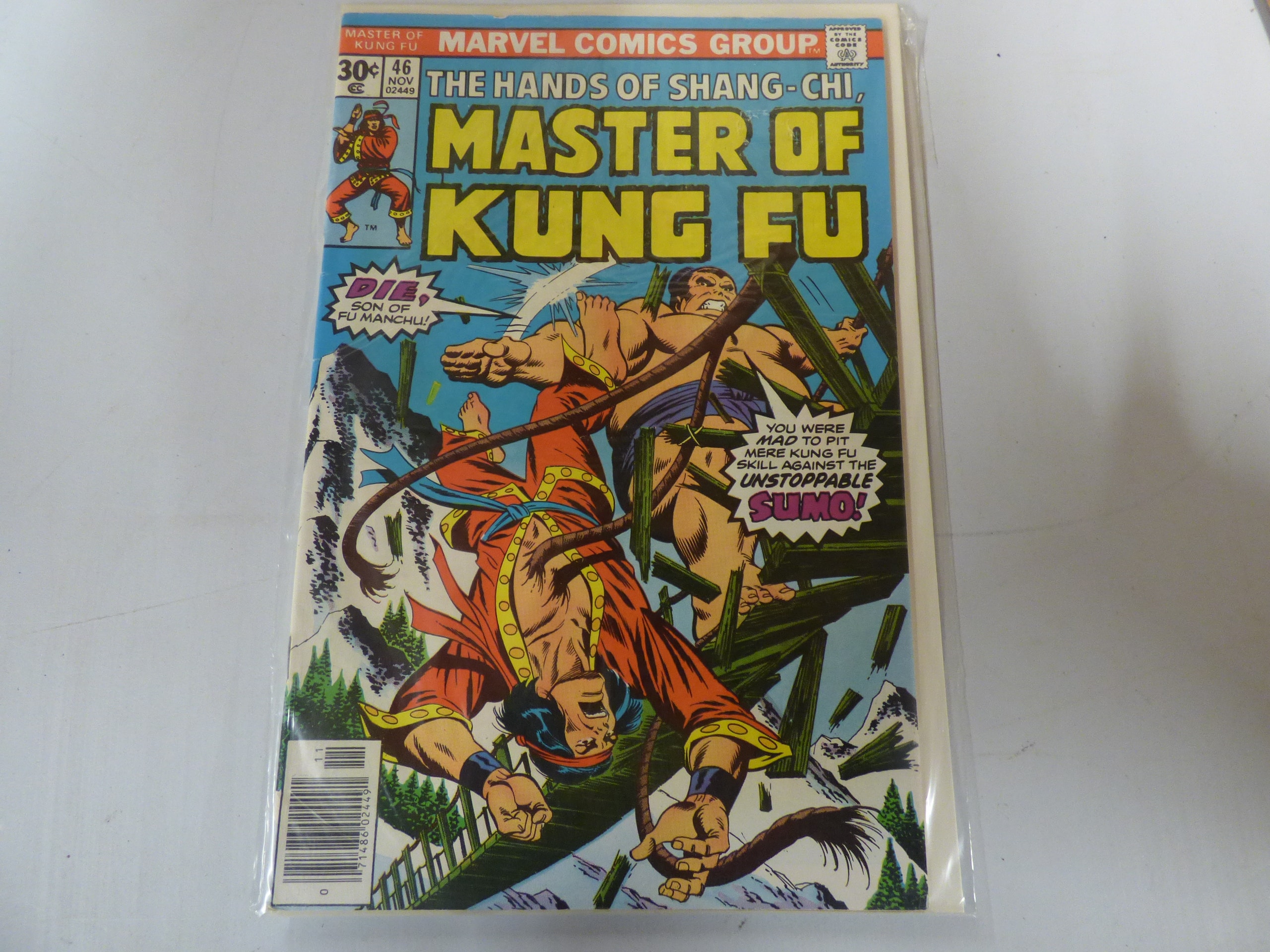 A Marvel Comics Group “Master of Kung Fu” comic book, issue #46 from November 1976, featuring Shang-Chi fighting Sumo on a blue, red, yellow, and green cover, with a 30¢ price.