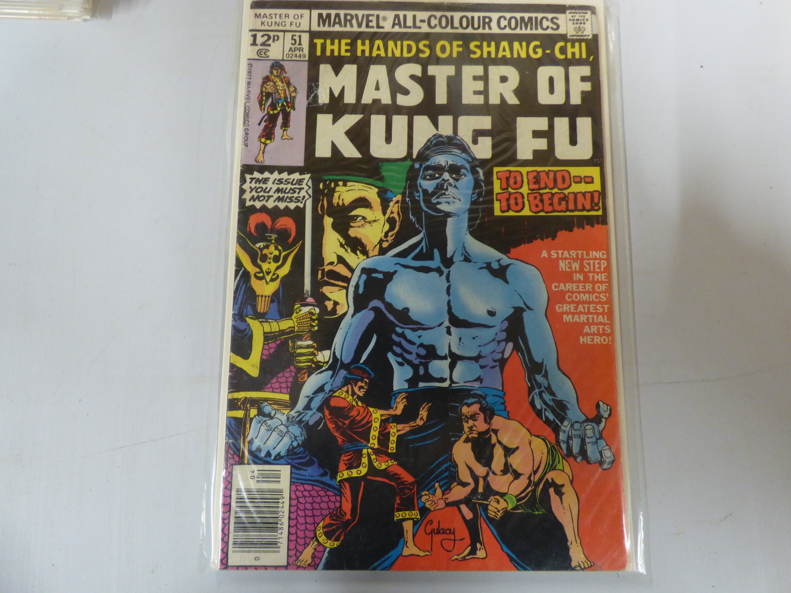 One Marvel All-Colour Comics ‘Master of Kung Fu’ comic book, issue #51, featuring black, red, blue, and yellow coloring, with text ‘THE HANDS OF SHANG-CHI’, ‘TO END– TO BEGIN!’, ‘THE ISSUE YOU MUST NOT MISS!’, ‘© 1977 MARVEL COMICS GROUP’, a ‘Gulacy’ signature, and prices ’12P’ and ’70’.