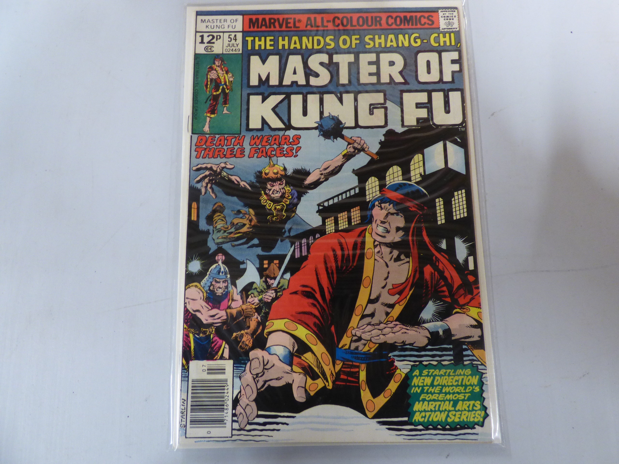 A multi-coloured Marvel comic book, “MASTER OF KUNG FU” issue #54, titled “THE HANDS OF SHANG-CHI, MASTER OF KUNG FU, ” published July 1977, with cover price 12P.