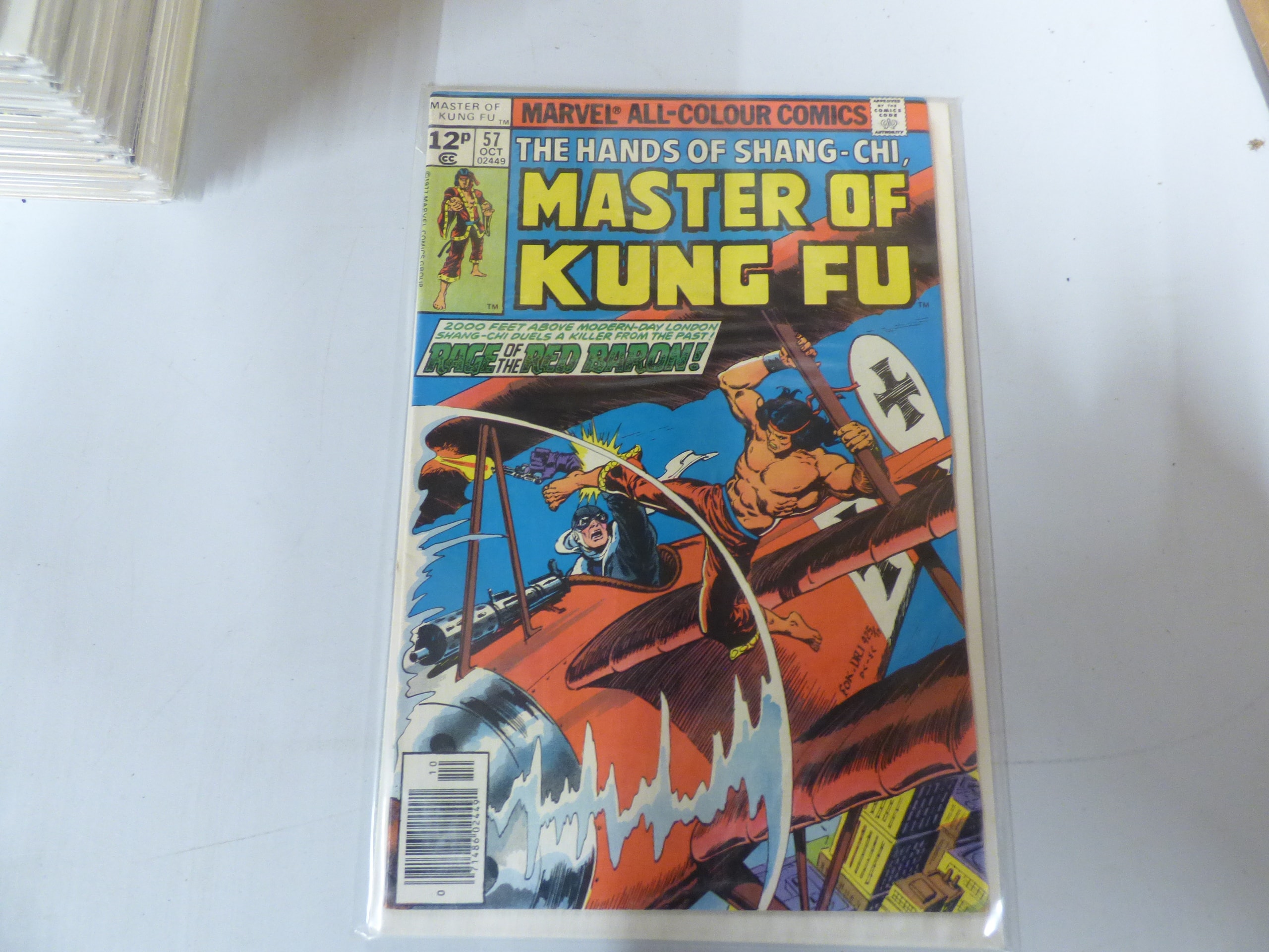 A multi-colored Marvel All-Colour Comics ‘The Hands of Shang-Chi, Master of Kung Fu’ comic book, issue #57 from October 1977, priced at 12P, featuring ‘RAGE OF THE RED BARON!’ and ‘©1977 MARVEL COMICS GROUP’ with the Comics Code Authority seal.