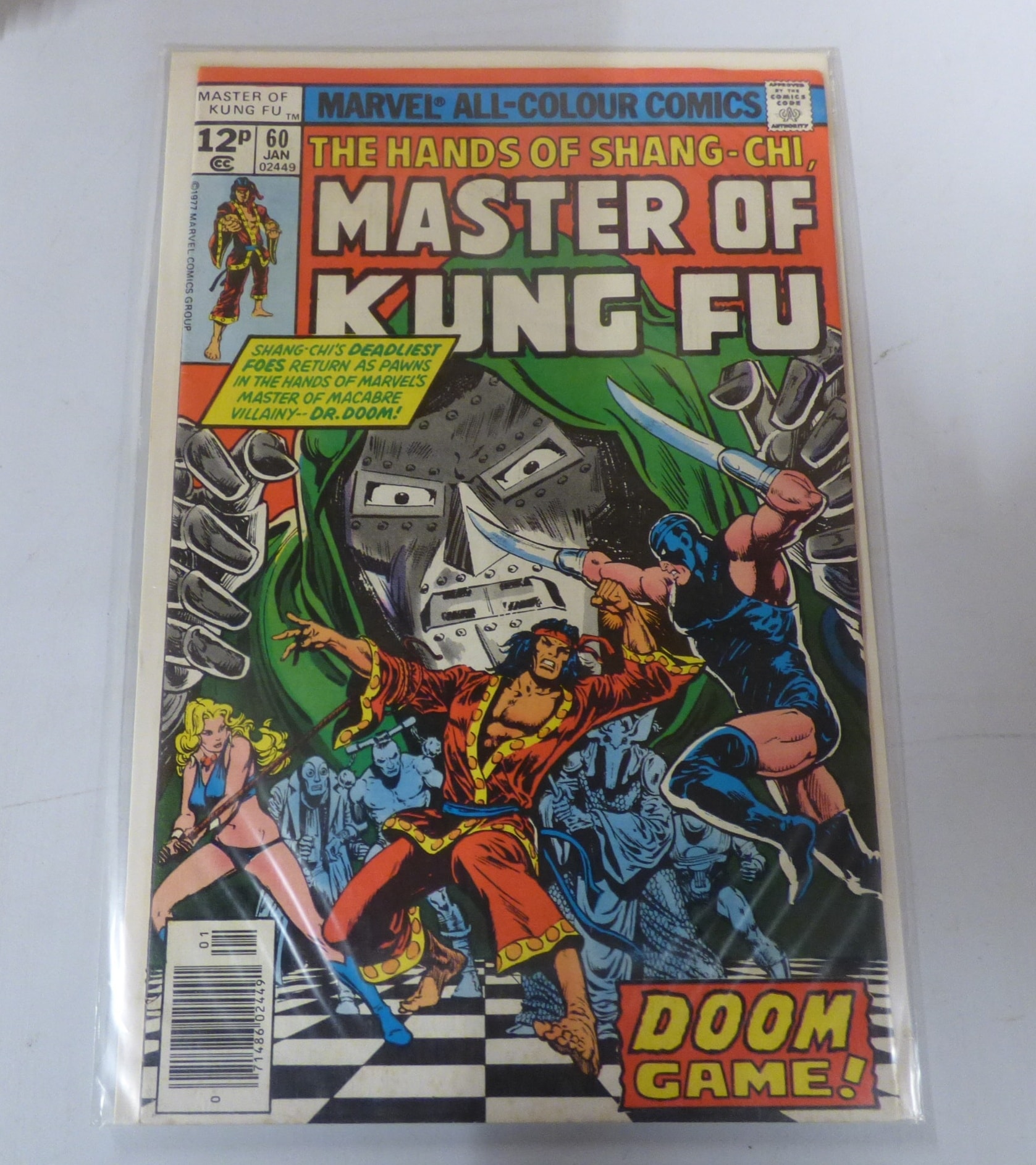 A multi-coloured comic book titled ‘MASTER OF KUNG FU™ MARVEL ALL-COLOUR COMICS THE HANDS OF SHANG-CHI’, published by Marvel Comics Group in 1977, identified as JAN 02449.