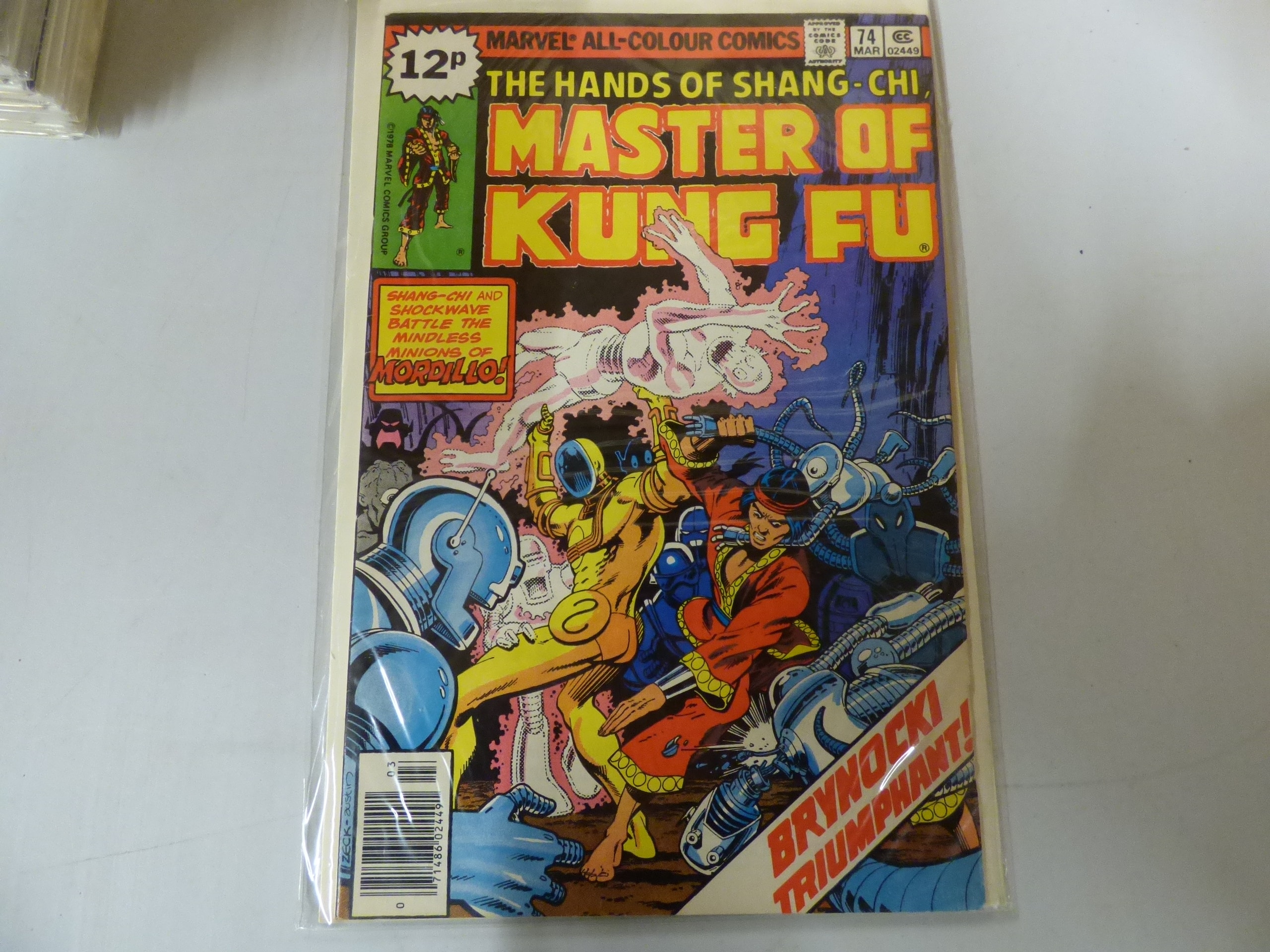 A Marvel All-Colour Comics comic book, “The Hands of Shang-Chi Master of Kung Fu” #74, dated MAR 02449, features a blue, yellow, and red cover, priced at 12p, with story text including “SHANG-CHI AND SHOCKWAVE BATTLE THE MINDLESS MINIONS OF MORDILLO!” and ©1978 Marvel Comics Group.