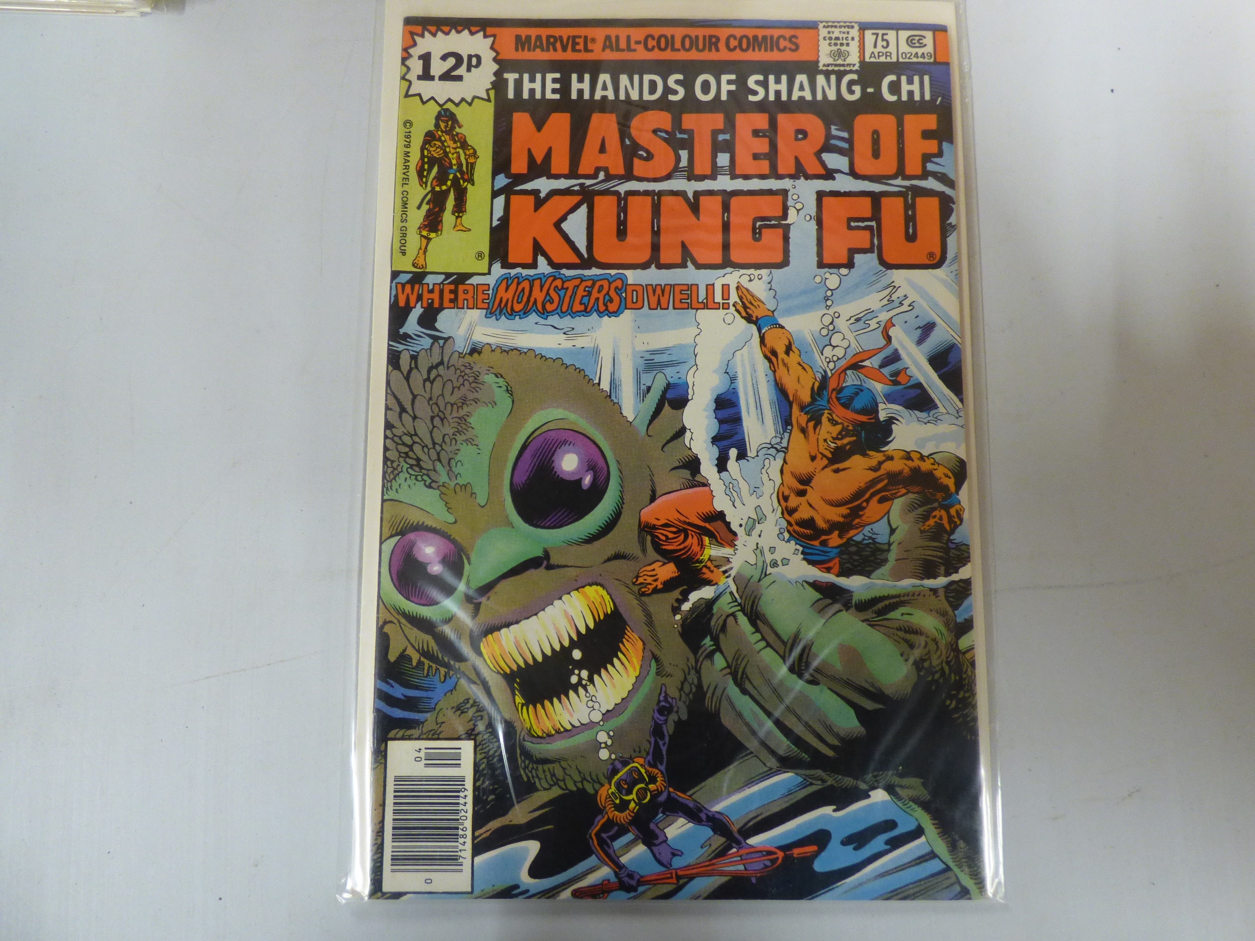 A multi-colored comic book, primarily green, orange, and blue, titled ‘MARVEL ALL-COLOUR COMICS, THE HANDS OF SHANG-CHI, MASTER OF KUNG FU, WHERE MONSTERS DWELL!’, with labels ’12p’, ’75’, ‘APPROVED BY THE COMICS CODE AUTHORITY’, ‘APR 02449’, and ‘© 1979 MARVEL COMICS GROUP’.